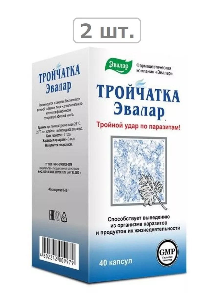 тройчатка эвалар n40 капс. Состав: гвоздика душистая, капсула (желатин, краситель диоксид титана), цветки пижмы обыкновенной, экстракт пижмы обыкновенной сухой, экстракт коры осины сухой; диоксид кремния аморфный, стеарат кальция, тальк