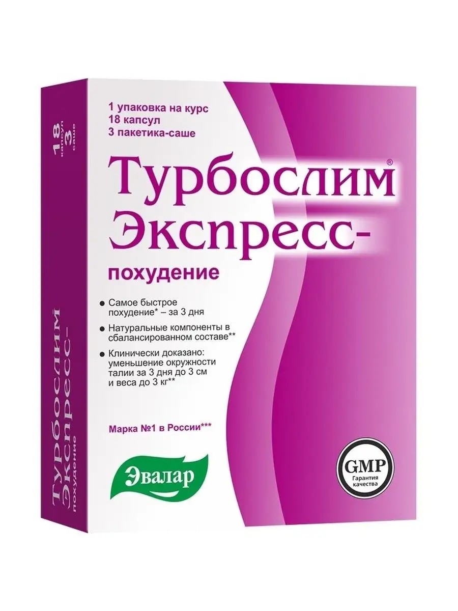 Самое быстрое похудение - за 3 дня!Запускает процессы ускоренного похудения. До минус 3х кг веса и 3х см в талии! Турбослим экспресс-похудение - самое быстрое похудение - за 3 дня!Уникальный комплекс натуральных компонентов для быстрого снижения веса: за 3 дня - до минус 3 кг и минус 3 см в талии! Только три дня, чтобы похудеть! Опять стали тесны любимые джинсы, а впереди важное для вас событие?Остались считанные дни, и вы не знаете, как быстро похудеть?Ситуация, знакомая почти каждой женщине! Но если у вас в запасе хотя бы 3 дня, значит, есть время все исправить! В этом вам поможет натуральный комплекс Турбослим экспресс-похудение.Он способствует:Ускоренному сжиганию жиров (гуарана, L-карнитин),Выведению лишней жидкости (зеленый чай, артишок),Активации обмена веществ (витамин С, листья красного винограда),Снижению аппетита (гарциния, кукурузные рыльца, хром),Оказывает мягкое ослабляющее действие (фенхель, фукус).С ним вы сможете всего за 3 дня уменьшить объемы до 3-х см!Комплекс включает в себя капсулы 3-х цветов для приема утром, в обед и вечером, а также напиток в саше на каждый из 3-х дней. Именно при таком сложном сочетании большого числа компонентов их активные вещества запускают ускоренные механизмы похудения.Турбослим экспресс-похудение - для тех, кому нужен быстрый результат! Турбослим экспресс-похудение - это экспресс-похудение за 3 дня! Худейте эффективно с Турбослим! Линия для похудения -Турбослим- расширяет ваши возможности в борьбе с лишним весом!Биодобавки линии можно применять как по отдельности, так и комплексно, ведь они прекрасно дополняют друг друга! С действием других БАД серии -Турбослим- вы можете ознакомиться в статье: Что делать, если лишний вес не тает даже от диет?