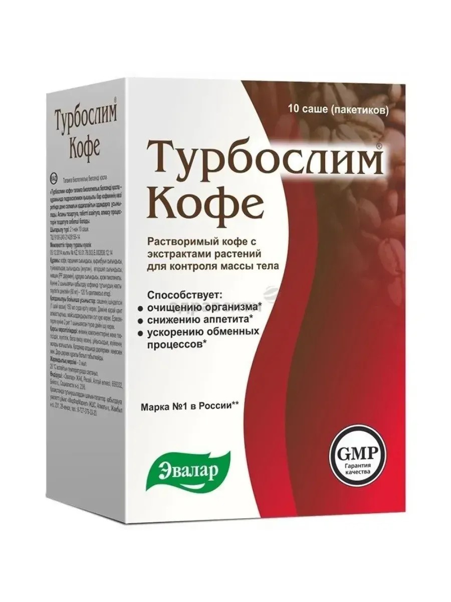 What's the most important thing in weight loss? Cleansing! To achieve and maintain a slim figure, replace your regular coffee with Turboslim coffee. This is one of the best ways to maintain a slim figure. The unique composition of Turboslim coffee will allow you to enjoy the beloved taste of real coffee while achieving a slim figure. Turboslim coffee consists of 88% high-quality Brazilian Arabica coffee, the taste of which will be appreciated by anyone who appreciates good coffee, as well as carefully selected herbal ingredients that promote active weight loss. Thanks to its balanced composition and the effectiveness of its ingredients, Turboslim coffee works in several directions at once: - it helps cleanse the body of waste and toxins - reduces appetite - accelerates metabolism - gives energy - Another advantage of Turboslim coffee is its convenient form in individual sachets, which are easy to take with you and use in any situation. How the ingredients work: - Garcinia cambogia extract slows down the conversion of excess carbohydrates into fat deposits and helps reduce appetite. - Turmeric extract promotes bile formation and secretion, maintaining metabolism and digestion. - Horsetail extract has a mild diuretic effect, promotes the elimination of metabolites from the body, maintains water-salt metabolism. - Burdock extract contains inulin, which creates conditions for the growth of its own beneficial intestinal microflora, promotes the elimination of metabolites from the body. - Senna extract helps improve the motor activity of the large intestine, has a mild laxative effect, promotes cleansing. - Vitamin PP promotes the expansion of small peripheral vessels, thereby improving blood circulation. - Chromium picolinate (organic form) maintains normal physiological levels of glucose in the blood, which in turn helps reduce cravings for sweets and natural weight loss. - Turboslim coffee is excellent Works in combination with Turboslim tea. Take advantage of Evalar's convenient slimming formula: Turboslim coffee in the morning, Turboslim tea in the evening! Turboslim tea and coffee—feel the difference!