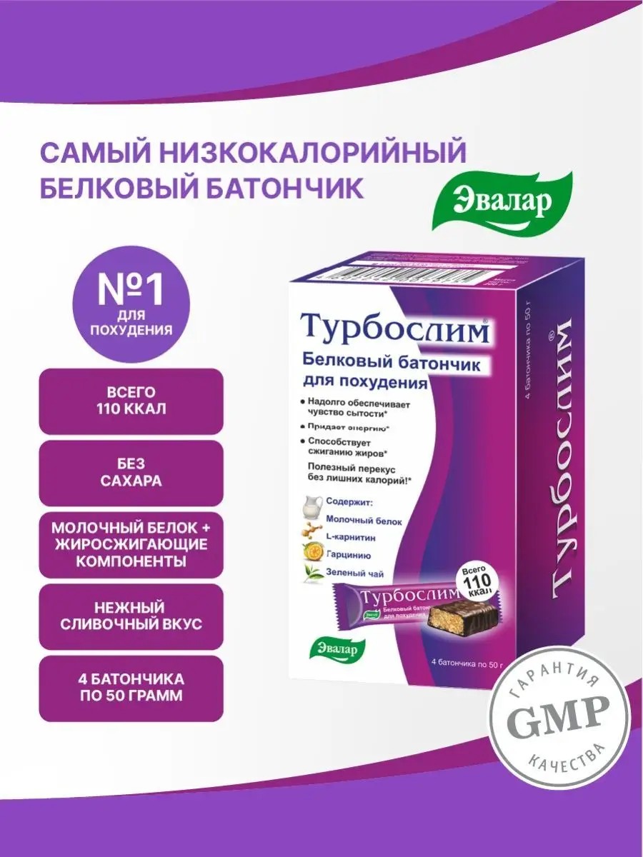 Батончик Турбослим Молочный протеин – самый низкокалорийный протеиновый батончик для похудения. В нем (батончик 50 г) всего 110 ккал, много качественного (чистого) сывороточного молочного белка - 22%, который считается одним из наиболее ценных и легкоусвояемых белков, а также жиросжигающие компоненты (L-карнитин, экстракты гарцинии и зеленого чая) и пиколинат хрома в высокой дозировке. Батончик не содержит слабительных ингредиентов!