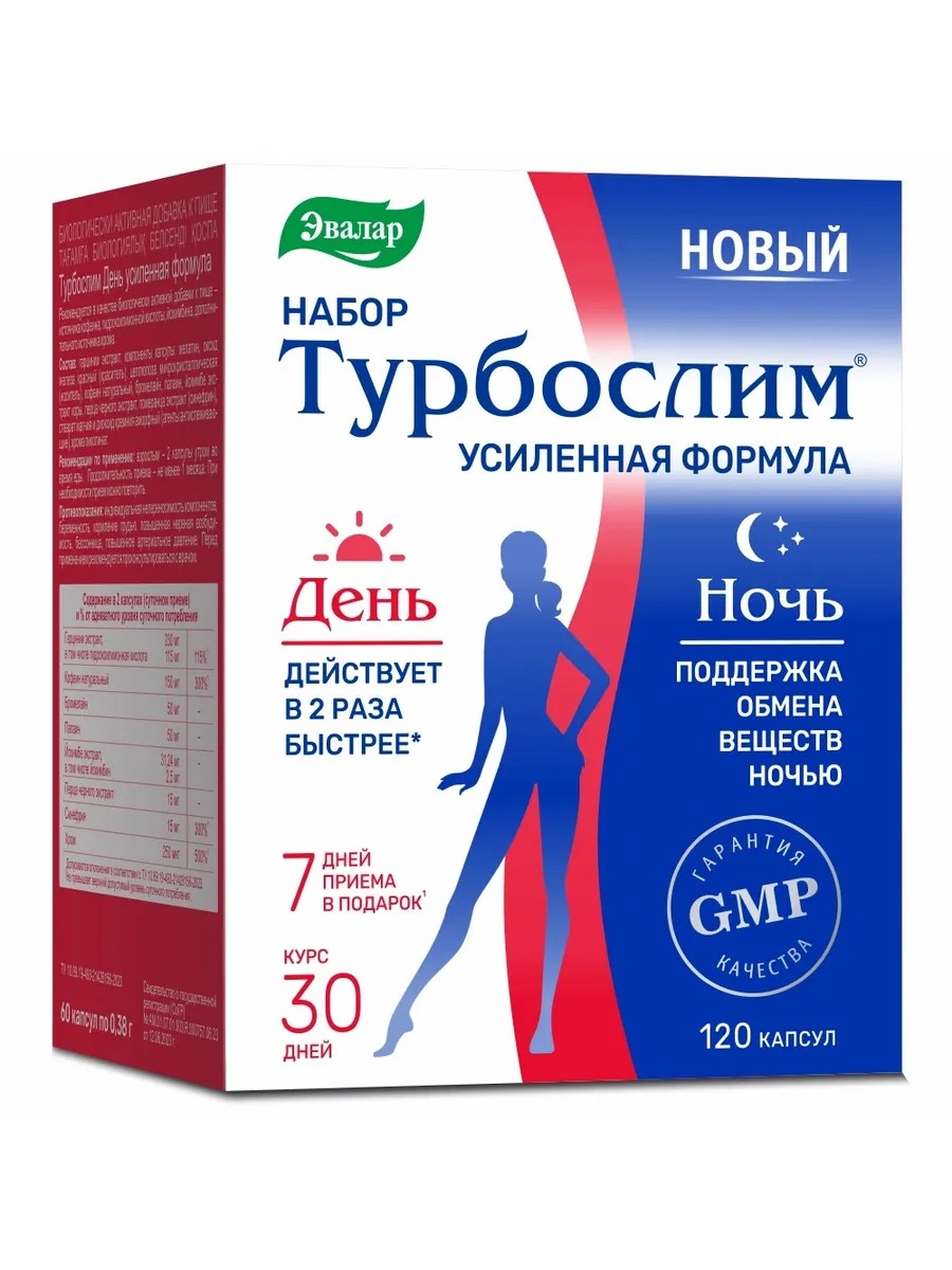 Турбослим набор/день усиленная формула капсулы+ночь усиленная формула капсулы - это биологически активная добавка (БАД) к пище для снижения веса. Набор объединил в себе популярные биокомплексы Турбослим День усиленная формула и Турбослим Ночь усиленная формула с новым составом и усиленным действием и теперь в 2 раза быстрее сжигает жиры днем и ускоряет процессы ночного похудения ночью. В упаковке 120 капсул: день - 60 штук и ночь - 60 штук.