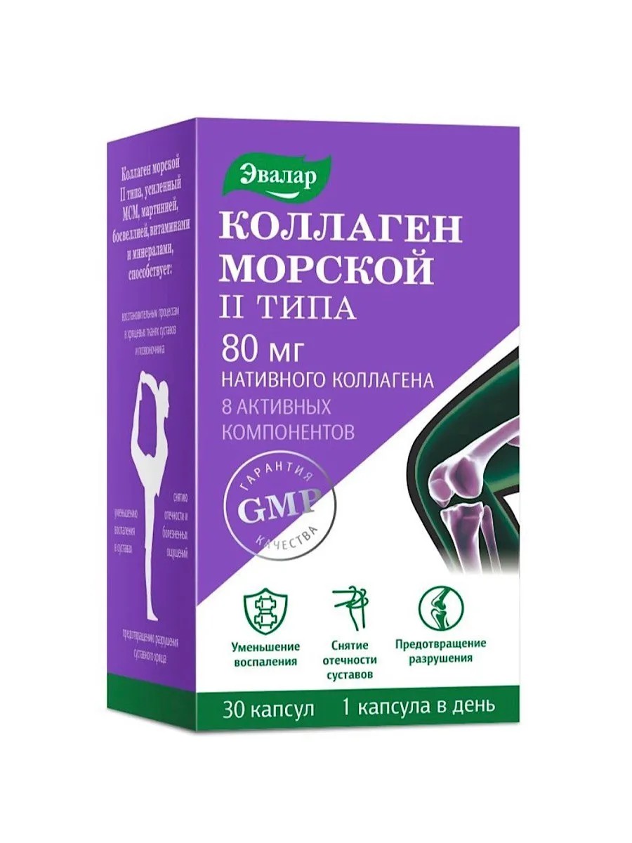 ЭВАЛАР КОЛЛАГЕН МОРСКОЙ II ТИПА N30 КАПС ПО 0,65ГЭВАЛАР КОЛЛАГЕН МОРСКОЙ II ТИПА - Биологически активная добавка (БАД) к пище - инновационная формула для суставов. В 2 раза больше нативного коллагена (80 мг), усиленного МСМ, мартинией, босвеллией, витаминами и минералами