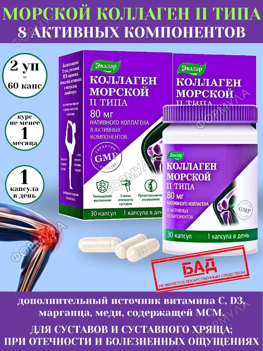 Морской коллаген 2 типа Эвалар с МСМ, мартинией, босвеллией, витаминами C, Д3, медью и марганцем — БАД для суставов, хрящей и позвоночника, поддержка соединительной ткани, противовоспалительное действие, способствует защите от боли и отеков.