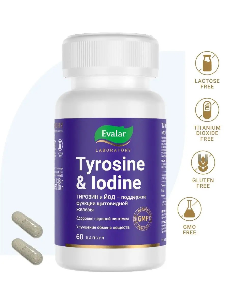 Тирозин и йод — комплекс активных компонентов для здоровья щитовидной железы.