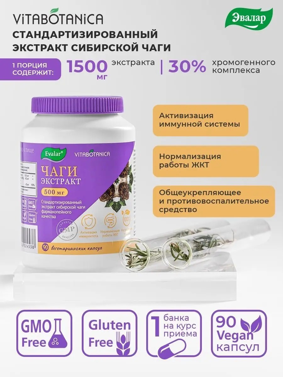Для облегчения состояния при вирусных заболеваниях, активации иммунной системы добавьте в свой ежедневный рацион три вегетарианские капсулы Витаботаника Чага, с содержанием хромогенного комплекса – 450 мг.Хромогенный комплекс – это набор биологически активных веществ – считается одним из ключевых компонентов чаги. По мнению ряда экспертов, в состав хромогенного комплекса входят полифенолы и пигмент меланин (который, кстати, и придает чаге и ее экстрактам и настойкам характерный черный цвет). Благодаря полифенолам, хромогенный комплекс обладает высокой антиоксидантной активностью.ВитаБотаника Чага способствует: активизации иммунной системы, облегчению состояния при вирусных заболеваниях, улучшению функционального состояния желудочно-кишечного тракта (устранению диспепсических явлений, нормализация работы желудка и кишечника), общему улучшению состоянияСогласно большой энциклопедии лекарственных трав и многочисленным научным публикациям, чага применяется в качестве симптоматического средства при онкологических заболеваниях, улучшающего общее состояние онкологических больных, а также при лечении заболеваний желудочно-кишечного тракта: хронических гастритах, дискинезии по гипокинетическому типу, язвенной болезни желудка и двенадцатиперстной кишки вне обострения, полипозах желудка и кишечника, гастралгии, энтералгии, заболеваниях печени и селезенки. Также при бессоннице, для успокоения нервной системы, при нарушении каталазного и протеазного обмена веществ, для повышения сопротивляемости организма к инфекционным заболеваниям. Средства на основе чаги назначают больным экземой, атопическим дерматитом, эритродермией; при ранах, травмах, ожогах, обморожениях, юношеских угрях, воспалениях кожи, герпесвирусных поражениях кожи и слизистых, при папилломах, кондиломах, лейкоплакии, верукозе.