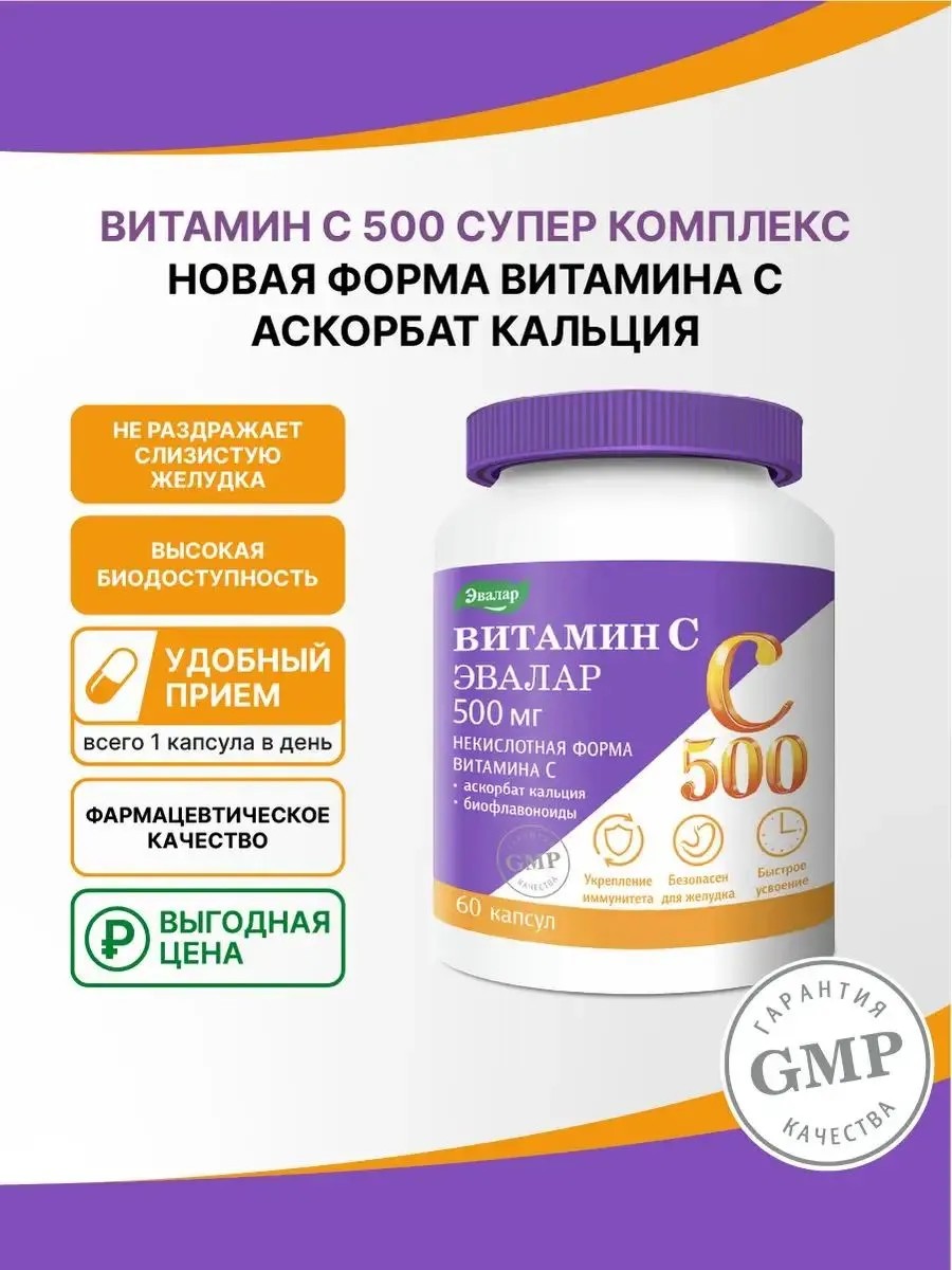 Витамины для иммунитета Витамин С в некислотной форме аскорбата кальция + биофлавоноиды для укрепления иммунитета Активное вещество: аскорбат кальция, экстракт ацеролы, экстракт шиповника, геспередин, рутин. Обычная аскорбиновая кислота, особенно в высоких дозировках, может раздражать слизистую желудка (кроме шипучих таблеток, содержащих соду, которая гасит кислотность). Для укрепления иммунитета без вреда желудку принимайте витамин c 500 супер-комплекс. Это витамин С в форме аскорбата кальция для иммунитета, которая имеет те же самые свойства, что и аскорбиновая кислота, но при этом обладает нейтральной кислотностью. В комплексе с рутином, геспередином, экстрактами ацеролы и шиповника витамины для мужчин и витамины для женщин способствует: укреплению иммунитета и снижению риска развития простудных и вирусных заболеваний; синтезу коллагена; уменьшению кровоточивости десен и появления синяков. Способ применения витамины для иммунитета взрослым: взрослым по 1 капсуле в день во время еды. Продолжительность приема – 1 месяц. Перед применением рекомендуется проконсультироваться с врачом.