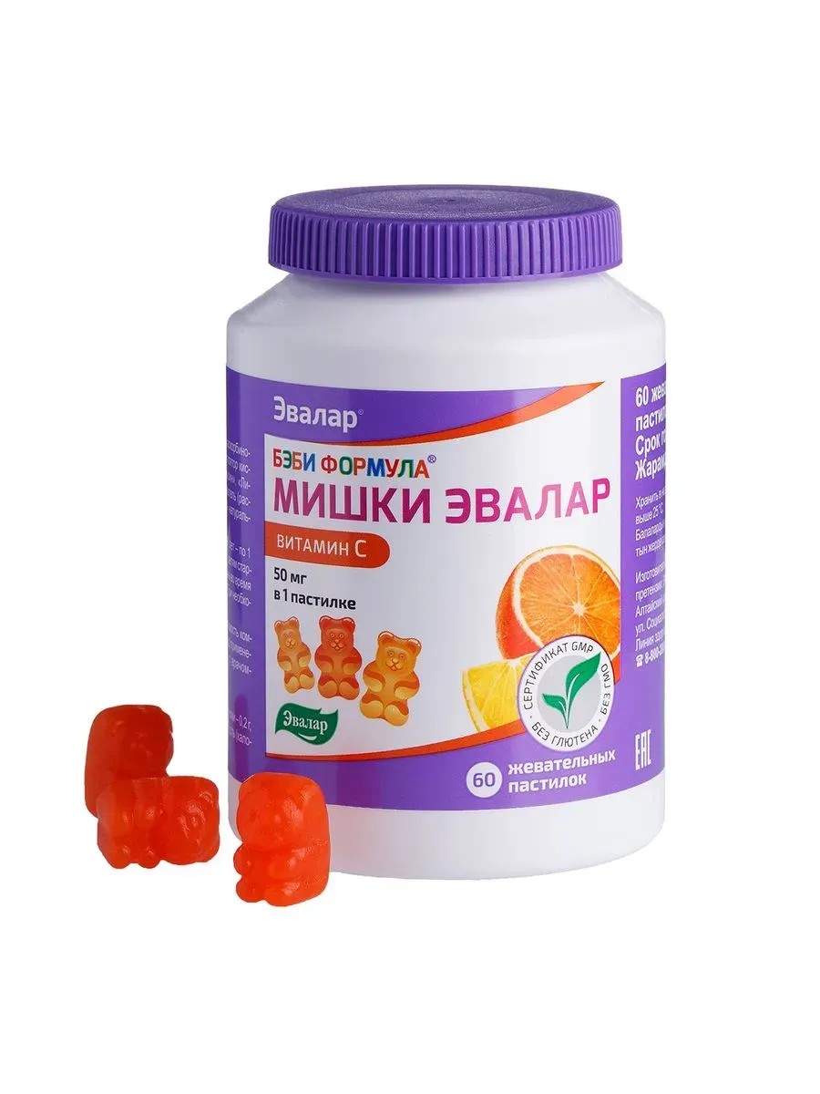 Бэби формула мишки витамин-С - это биологически активная добавка (БАД) к пище, комплекс из жевательных пастилок, 60 штук в упаковке. Эти жевательные пастилки специально разработаны для восполнения недостатка витамина С и поддержания его уровня для детей с 3 лет.Каждая пастилка содержит 100% суточной нормы витамина С - 50 мг.Благодаря этому Бэби Формула Мишки Витамин С способствует: обогащению организма необходимым количеством витамина С, укреплению защитных сил организма, что особенно актуально в сезон простуд, полноценному развитию организма ребенка. Приятный апельсиновый и лимонный вкус. Без искусственных красителей, ароматизаторов и консервантов. Без глютена и ГМО. Детям от 3 до 7 лет - по 1 жевательной пастилке 1 раз в день во время еды, детям старше 7 лет - по 1 жевательной пастилке 2 раза в день во время еды. Продолжительность приема - 1-2 месяца. При необходимости прием можно повторить. Витамин С следует принимать во время или после приема пищи. Перед применением рекомендуется проконсультироваться с врачом-педиатром.