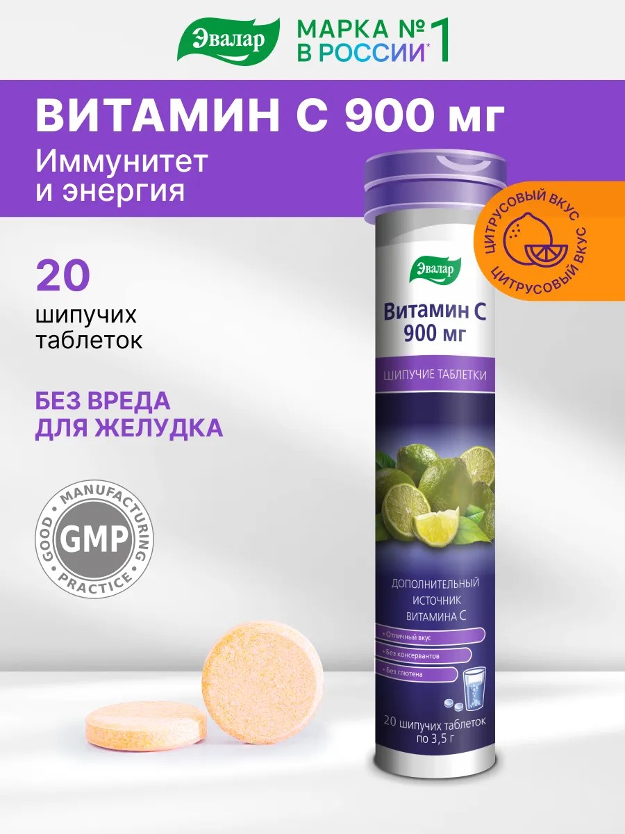Эвалар Витамин С 900 мг, 20 шипучих таблеток для иммунитета