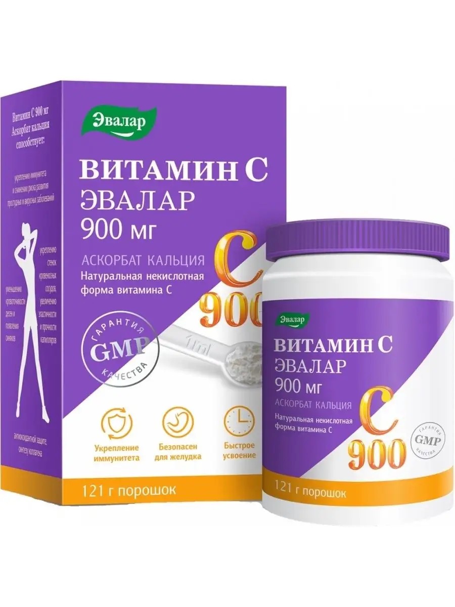 The Evalar company offers an excellent solution for those who have problems with the gastrointestinal tract. Its new development is vitamin C in the form of calcium ascorbate, which has the same properties as ascorbic acid, but has a neutral acidity. Vitamin C 900 mg Calcium ascorbate helps to: - strengthen the immune system and reduce the risk of colds and viral diseases; - strengthen the walls of blood vessels; - increase the elasticity and strength of capillaries; - reduce bleeding gums and bruising; - antioxidant protection; - collagen synthesis. Directions: Adults: Dissolve 1 measuring spoon (1/3 teaspoon - 1.1 grams) or 1 sachet (stick) (1.1 grams) in a glass of water or any drink. Duration of use is at least 2 weeks. If necessary, the course of treatment can be continued. The finished drink has a neutral taste.