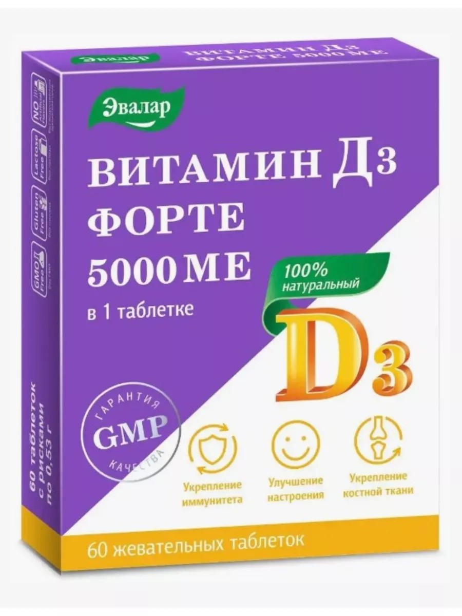 Витамин D3 Форте - это биологически активная добавка к пище , разработанная для повышения уровня витамина D в организме. Он состоит из 60 жевательных таблеток, каждая из которых содержит 125 мкг (5000 МЕ) витамина D3. Этот продукт обеспечивает организм необходимой дозой витамина D3, который является не только важным для поддержания здоровья костей, но и определяет многие другие аспекты здоровья, такие как иммунная система, сердечно-сосудистая функция и многое другое. Благодаря жевательной форме таблеток, они легко и быстро усваиваются организмом, что делает их идеальным выбором. Приобретая Витамин D3 Форте, вы обеспечиваете свой организм необходимой дозой витамина D3, который помогает поддерживать ваше общее здоровье и благополучие. Способ применения и дозы