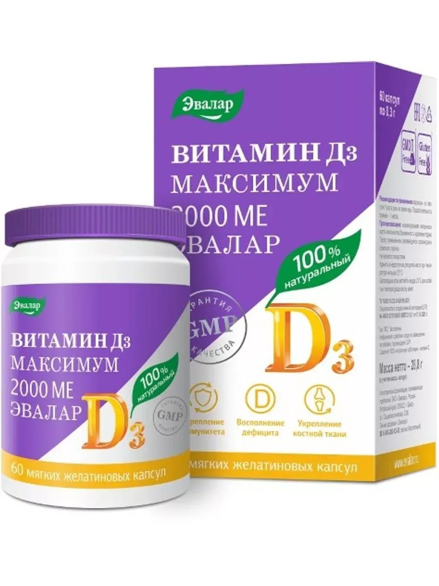 Витамин д 3 максимум 2000 МЕ Эвалар 60 шт. капсулы массой 0,3 г натуральный витамин Д3 с высокой дозировкой 2000 МЕ в мягких желатиновых капсулах