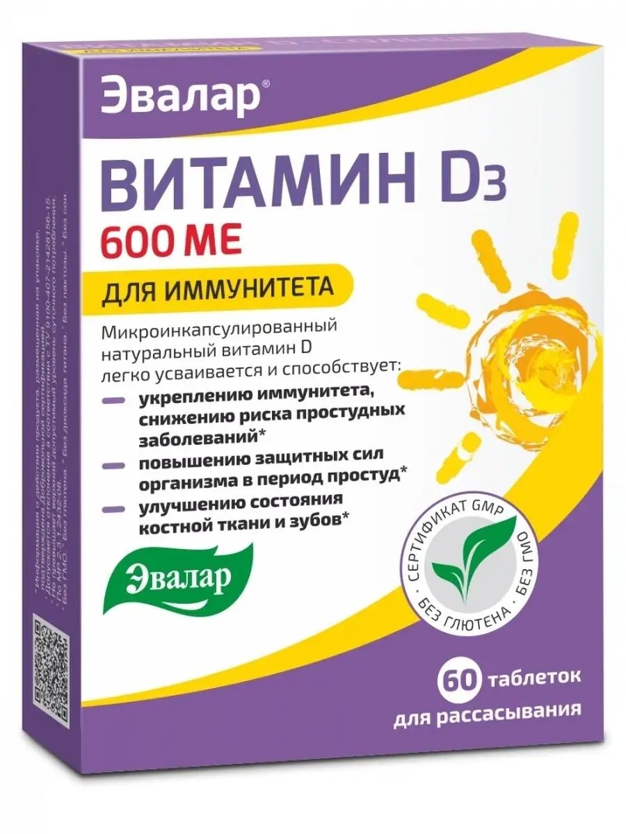 Витамин D3 600 МЕ Эвалар способствует: укреплению иммунитета, снижению риска простудный заболеваний.Витамин D очень важен для нашего здоровья, он участвует в 200 функциях организма. Вопреки распространенному мнению о пользе витамина D только для костной ткани, в последнее время возобновился интерес к другим его уникальным свойствам, показывающим, что польза витамина D распространяется далеко за пределы здоровья костей.Витамин D также:- снижает риск развития остеопороза;- помогает поддерживать полное здоровье и хорошо себя чувствовать. Способ применения: Взрослым – по 1 таблетке в день. Таблетку держать во рту до полного рассасывания, или сублингвальный (подъязычный) прием. Продолжительность приема – 1-2 месяца. Возможен повторный прием в течение года.