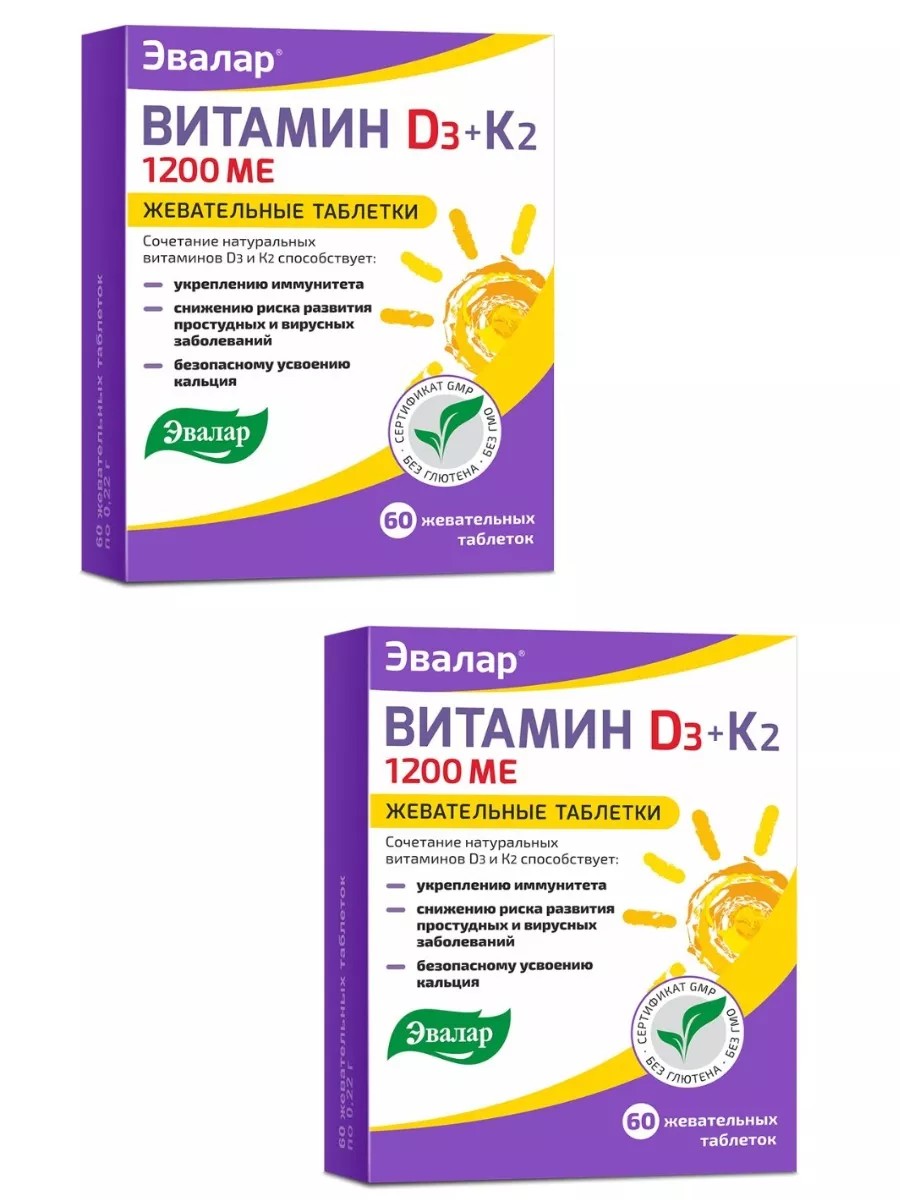 Эвалар Витамин Д3 1200 МЕ+К2 60шт/2уп