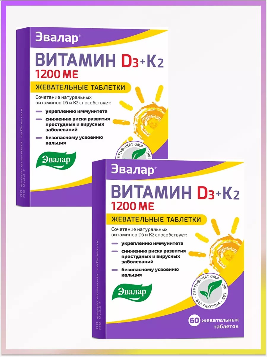 Витамин Д3 Эвалар 1200 МЕ + К2 жевательные таблетки, 60 шт.