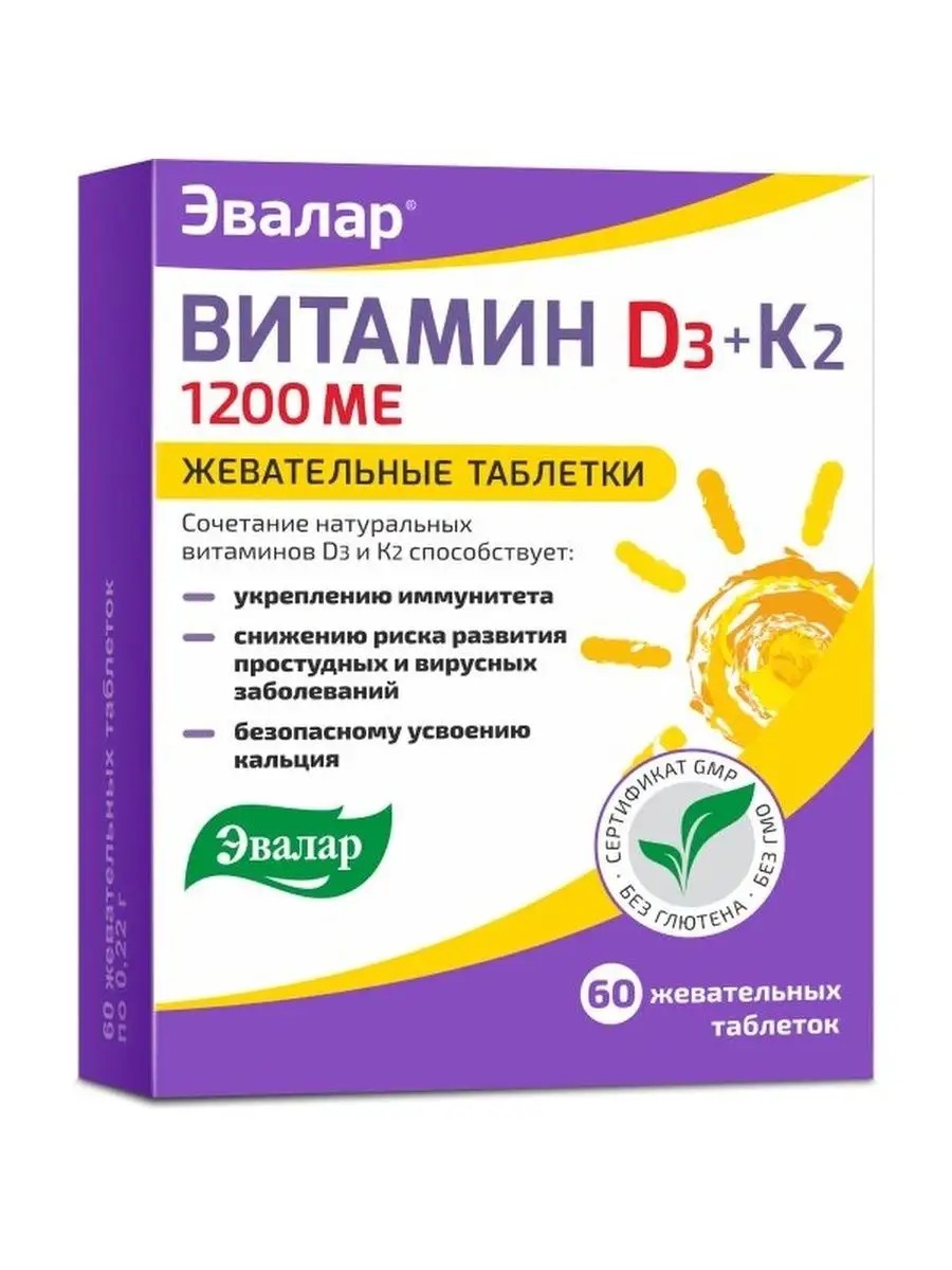 Эвалар Витамин Д3 1200МЕ + К2 №60