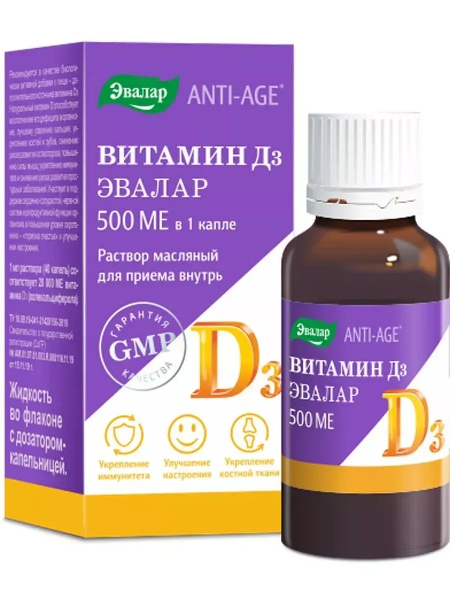 Витамин D3 – это биологически активная добавка (БАД) к пище - незаменимый элемент для нашего здоровья, особенно в условиях нашей суровой зимы и нехватки солнечного света. Также этот витамин важен для правильного функционирования костной и иммунной систем, а также влияет на метаболизм кальция в организме. Но как получить достаточное количество витамина D3 в зимнее время года? Очень просто: воспользуйтесь капельницей с жидкостью витамина D3 Эвалар, которая содержит 500 МЕ в 1 капле. Капельница очень удобна в использовании и позволяет достаточно точно дозировать количество вводимого витамина. Всего несколько капель в день и ваш организм получит необходимую дозу витамина D3 для поддержания здоровья костей, укрепления иммунитета и в общем для повышения качества жизни в зимний период.РЕКОМЕНДАЦИИ ПО ПРИМЕНЕНИЮ:Взрослым и детям с 3-х лет по 1 капле (500 МЕ) в день во время еды или согласно рекомендациям врача.Допускается добавлять в ложку с едой, на кусочек хлеба и т.д.Продолжительность приема - 1-2 месяца.