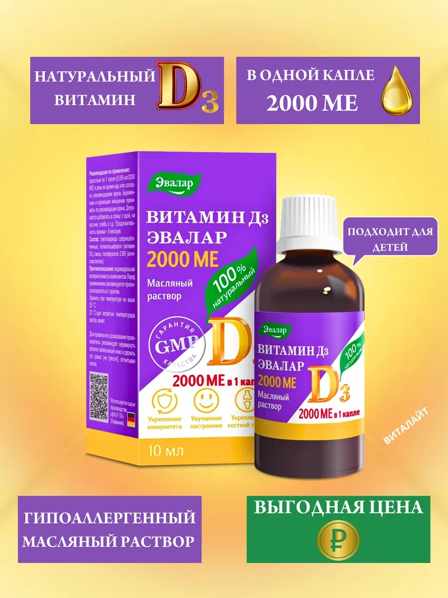 Витамин Д3 2000 МЕ капли от «Эвалар» - это дополнительный источник витамина D3.