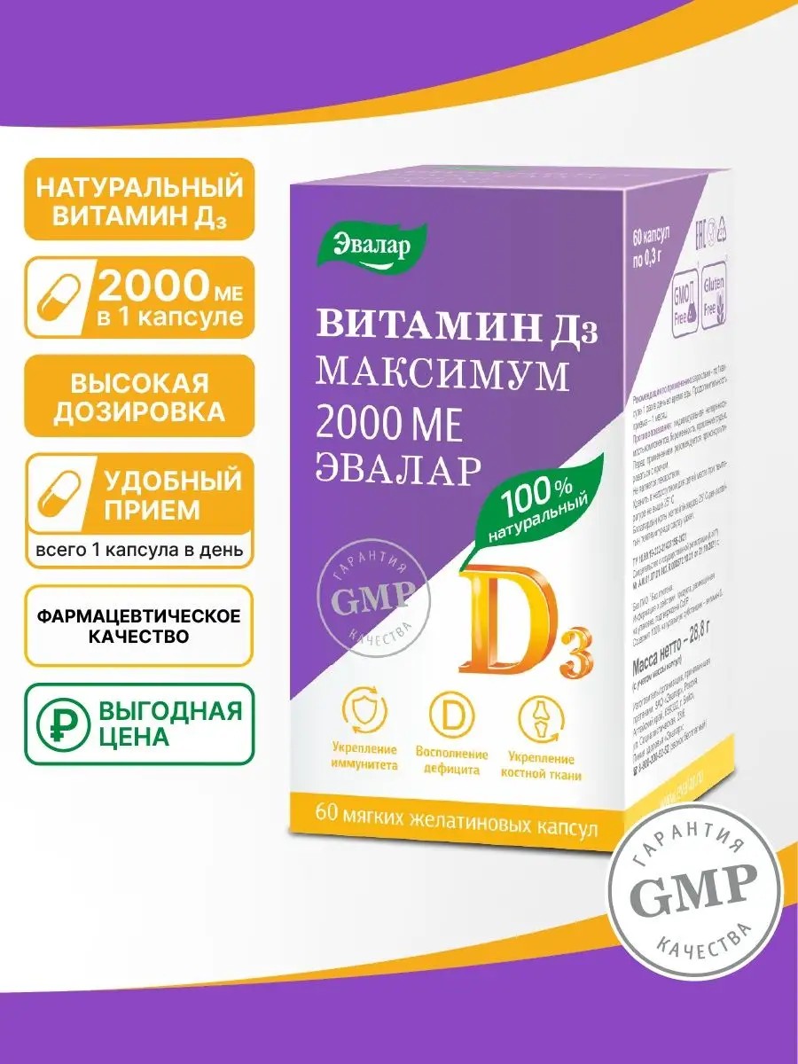 Эвалар Витамин Д3 2000 МЕ максимум, 60 капсул