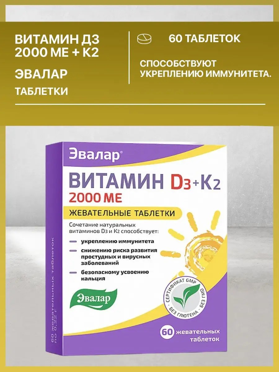 Эвалар Витамин Д3 2000 МЕ + К2, 60 жевательных таблеток