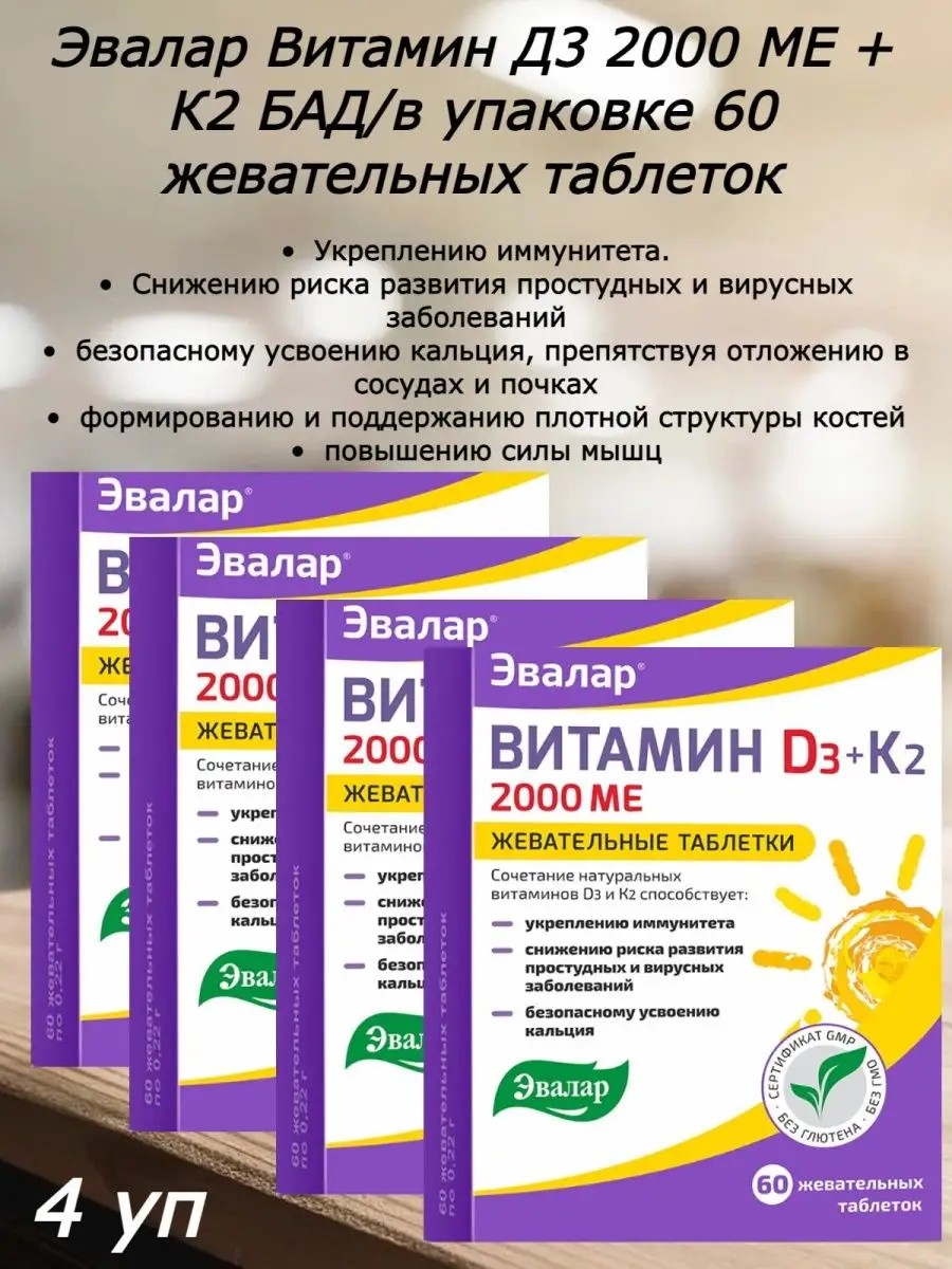 Over the past few years, vitamin D3 has grown in popularity worldwide. It has also been included in intensive care protocols for COVID-19 patients and as a preventative measure against coronavirus infection. This is no coincidence. It is crucial for our health, as it boosts immunity, reduces inflammation and viral activity, and is involved in 200 other bodily functions. Evalar's Vitamin D3 2000 IU + K2 chewable tablets contain high-dose natural vitamin D3, enhanced with natural vitamin K2 in its most bioavailable form, MK-7. K2 complements the effects of vitamin D and promotes its better absorption. This is the only high-dose vitamin D3 in Russia, fortified with vitamin K2. And thanks to the convenient chewable tablet form, **Vitamin D3 2000 IU + K2** from Evalar is absorbed even better.**Vitamin D3 2000 IU + K2 promotes:** strengthening the immune system; reducing the risk of colds and viral diseases; safe calcium absorption, preventing deposits in blood vessels and kidneys; forming and maintaining a dense bone structure; increasing muscle strength.**How do the ingredients work?****Vitamin D** is a unique adaptive immunomodulator. It enhances innate immunity, activates antimicrobial peptides that eliminate pathogens such as microbes, bacteria, and viruses.3 Vitamin D strengthens cellular immunity, reduces the level of "cytokine storm"4, and also supports lung function, reducing the inflammatory response caused by viruses.5 Furthermore, it stimulates the production of antimicrobial proteins in the mucous membranes of the upper respiratory tract. Vitamin D3 deficiency has recently become so common that many experts recommend increasing the daily dosage according to individual needs. According to clinical guidelines from the Russian Association of Endocrinologists, to maintain optimal vitamin D3 levels, adults require 2,000 IU or more daily. Vitamin K2 is a key component in regulating metabolic processes and calcium distribution in the body. It strengthens bone tissue by activating the production of the protein osteocalcin, which increases bone density, prevents osteoporosis, and reduces the risk of fractures. It has a positive effect on the cardiovascular system, preventing the deposition of calcium crystals on the walls of blood vessels, thereby reducing the risk of calcification. It improves the absorption of calcium and vitamin D3, also preventing calcium deposits in the kidneys and joints. Prevents premature aging, improves skin structure, and prevents premature wrinkles. This vitamin is available in several forms, but MK-7 (menaquinone-7) has the highest level of bioavailability. When you pick up a package of vitamin K2 from the pharmacy shelf, look for the designation MK-7. If the manufacturer does not indicate the form of K2, the supplement probably contains MK-4. What is the difference? MK-7 remains active longer, unlike MK-4, which loses its properties faster and is less effective. MK-7 circulates in the blood for about 72 hours and during this time manages to reach all organs, including bone tissue. It is in this bioavailable form that vitamin K2 is contained in the preparation **Vitamin D3 2000 IU + K2.**CompositionGlucose, cholecalciferol, sorbitol (carrier), maltodextrin, menaquinone-7; Amorphous silicon dioxide, stearic acid and calcium stearate (anti-caking agents), corn starch. Active ingredient content per 1 tablet: Vitamin D3 - 2000 IEVitamin K - 12 mcg**Recommended as a dietary supplement** – an additional source of vitamin D3, containing vitamin K2. The vitamins included in the composition help strengthen the immune system, reduce the risk of colds and viral diseases, safely absorb calcium, preventing deposits in blood vessels, joints and kidneys, form and maintain a dense bone structure, and increase muscle strength.**Recommended for use**Adults - 1/4 tablet per day with meals. In conditions accompanied by an increased need for vitamins, as recommended by a doctor. The tablets can be sucked or chewed. Duration of admission is 2-3 months.**Contraindications**Individual intolerance to the components, pregnancy, breastfeeding. It is recommended to consult a doctor before use. Store at a temperature not exceeding 25ᵒ C. **Shelf life** 2 years