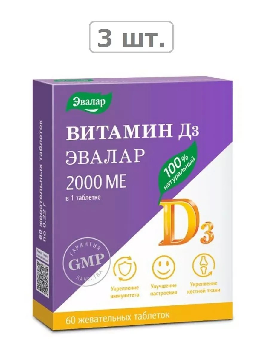 Эвалар витамин д3 2000ме эвалар n60 табл жеват по 0,22г-3шт