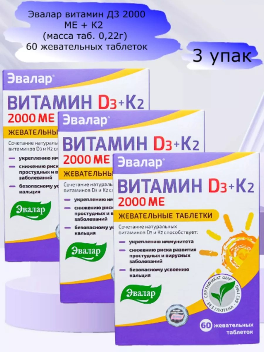 Витамин Д3 2000 МЕ + К2 способствует: укреплению иммунитета; снижению риска развития простудных и вирусных заболеваний; безопасному усвоению кальция, препятствуя отложению в сосудах и почках;формированию и поддержанию плотной структуры костей;повышению силы мышц. Противопоказания: нет данных о противопоказаниях. Витамин D - является уникальным адаптивным иммуномодулятором. Он усиливает врожденный иммунитет, активизирует антимикробные пептиды, которые устраняют патогенные организмы такие как микробы, бактерии и вирусы.Витамин D укрепляет клеточный иммунитет, снижает уровень цитокинового шторма, а также поддерживает функцию легких, уменьшая воспалительную реакцию, вызванную вирусами. Помимо этого, он также стимулирует выработку антимикробных белков в слизистых оболочках верхних дыхательных путей. В последнее время дефицит витамина D3 настолько высок, что многие специалисты рекомендуют повышать суточную дозировку в соответствии с индивидуальными потребностями. Согласно клиническим рекомендациям Российской ассоциации эндокринологов для поддержания оптимального уровня витамина D3 взрослому человеку требуется 2000 МЕ и выше ежедневно.Витамин К2 - ключевой компонент в регуляции обменных процессов и распределения кальция в организме. Укрепляет костную ткань за счет того, что активирует производство белка остеокальцина, который повышает плотность костной ткани, предотвращает остеопороз и снижает риск переломов. Положительно влияет на сердечно-сосудистую систему, предотвращает отложение кристаллов кальция на стенках сосудов, тем самым снижая риск кальциноза. Улучшает усвоение кальция и витамина D3, предотвращая отложение кальция также в почках и суставах. Предотвращает раннее старение, улучшает структуру кожи, препятствует преждевременному появлению морщин. У этого витамина несколько форм, но самый высокий уровень биодоступности имеет МК-7 (менахинон-7). Взяв на аптечной полке упаковку витамина К2, обратите внимание, чтобы на ней было обозначение МК-7. Если производитель не указывает форму К2, вероятно добавка содержит МК-4.В чем же разница? МК-7 дольше остается активным в отличие от МК-4, который быстрее теряет свои свойства и является менее эффективным. МК-7 циркулирует в крови около 72 часов и за это время успевает достигнуть всех органов, в том числе и костной ткани. Именно в такой биодоступной форме витамин К2 содержится в препарате Витамин Д3 2000 МЕ + К2.Способ применения и дозировкаВзрослым - по 1/4 таблетки в день во время еды.При состояниях, сопровождающихся повышенной потребностью в витаминах - по рекомендации врача. Таблетки допускается рассасывать или разжевывать.Продолжительность приема - 2-3 месяца.