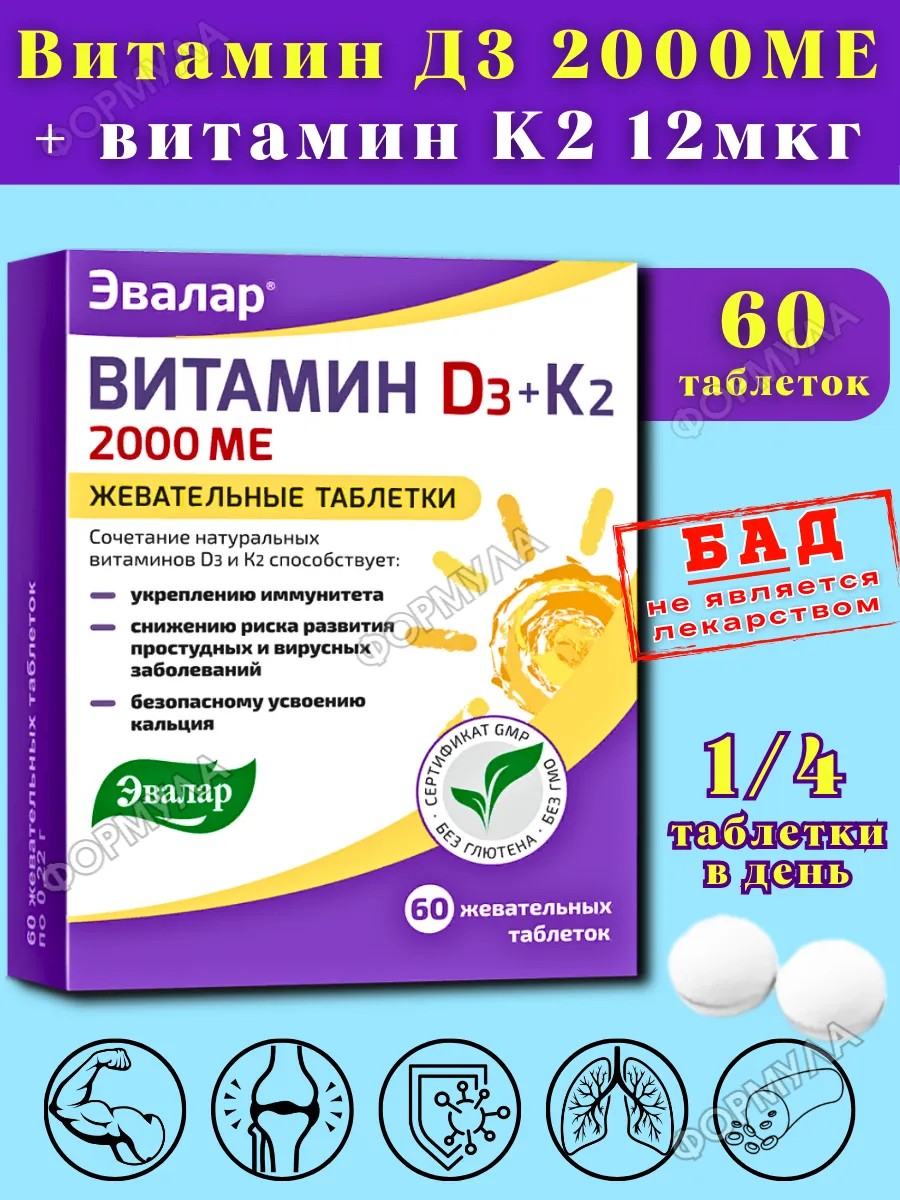| Полное наименование товара | Эвалар витамин д 3 2000 МЕ+к 2 60 шт. таблетки жевательные массой 0,22 г |
