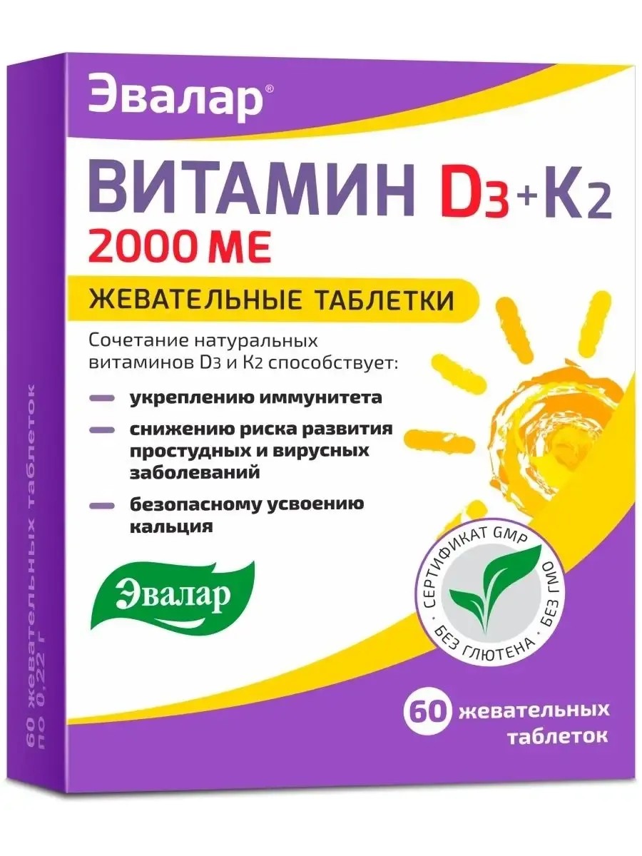 За последние несколько лет во всем мире выросла популярность витамина D3. Он также был включен в протокол проведения интенсивной терапии у пациентов с COVID-19 и как одно из средств профилактики коронавирусной инфекции1. Это не случайно. Он очень важен для нашего здоровья, так как повышает иммунитет, снижает уровень воспаления и вирусной активности, а также участвует еще в двухстах функциях организма.В жевательных таблетках Витамин Д3 2000 МЕ + К2 от компании «Эвалар» натуральный витамин D3 с высокой дозировкой усилен натуральным витамином К2 в самой биодоступной форме МК-7. К2 дополняет действие витамина D тем и помогает ему лучше усваиваться организмом. Это единственный в России витамин D3 с высокой дозировкой, усиленный витамином К22. А за счет удобной формы жевательных таблеток Витамин Д3 2000 МЕ + К2 от «Эвалар» усваивается еще лучше.Как работают ингредиенты?Витамин D - является уникальным адаптивным иммуномодулятором. Он усиливает врожденный иммунитет, активизирует антимикробные пептиды, которые устраняют патогенные организмы такие как микробы, бактерии и вирусы3. Витамин D укрепляет клеточный иммунитет, снижает уровень «цитокинового шторма»4, а также поддерживает функцию легких, уменьшая воспалительную реакцию, вызванную вирусами5. Помимо этого, он также стимулирует выработку антимикробных белков в слизистых оболочках верхних дыхательных путей5.В последнее время дефицит витамина D3 настолько высок, что многие специалисты рекомендуют повышать суточную дозировку в соответствии с индивидуальными потребностями. Согласно клиническим рекомендациям Российской ассоциации эндокринологов для поддержания оптимального уровня витамина D3 взрослому человеку требуется 2000 МЕ и выше ежедневно6.Витамин К2 - ключевой компонент в регуляции обменных процессов и распределения кальция в организме. Укрепляет костную ткань за счет того, что активирует производство белка остеокальцина, который повышает плотность костной ткани, предотвращает остеопороз и снижает риск переломов. Положительно влияет на сердечно-сосудистую систему, предотвращает отложение кристаллов кальция на стенках сосудов, тем самым снижая риск кальциноза. Улучшает усвоение кальция и витамина D3, предотвращая отложение кальция также в почках и суставах. Предотвращает раннее старение, улучшает структуру кожи, препятствует преждевременному появлению морщин.У этого витамина несколько форм, но самый высокий уровень биодоступности имеет МК-7 (менахинон-7). Взяв на аптечной полке упаковку витамина К2, обратите внимание, чтобы на ней было обозначение МК-7. Если производитель не указывает форму К2, вероятно добавка содержит МК-4. В чем же разница? МК-7 дольше остается активным в отличие от МК-4, который быстрее теряет свои свойства и является менее эффективным. МК-7 циркулирует в крови около 72 часов и за это время успевает достигнуть всех органов, в том числе и костной ткани.Именно в такой биодоступной форме витамин К2 содержится в препарате Витамин Д3 2000 МЕ + К2.