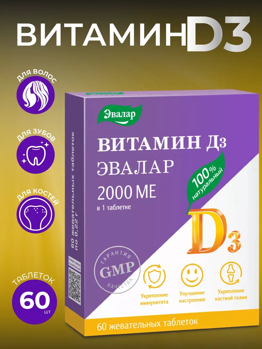 Витамин D3 играет важную роль в поддержании здоровья костей, иммунной системы, регуляции уровня глюкозы в крови и давления. Зубы, глаза и мышцы также зависят от оптимального уровня этого витамина. Добавки от Эвалар изготавливаются из натуральных ингредиентов, без искусственных красителей и консервантов, и представлены в виде жевательных таблеток по 60 штук в упаковке.