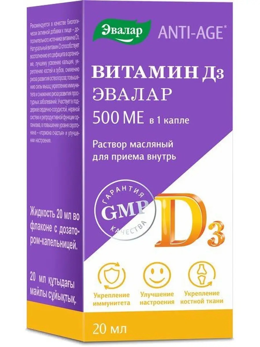 Vitamin D3 oil solution for oral administration, 500 IU per drop. Vitamin D3 helps strengthen the immune system and reduce the risk of developing colds.