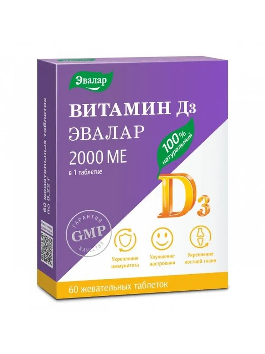 За последние несколько лет во всем мире выросла популярность витамина D3. По данным ВОЗ, 80% россиян испытывает дефицит витамина D32. Он очень важен для нашего здоровья, так как повышает иммунитет, снижает уровень воспаления и вирусной активности, а также участвует еще в двухстах функциях организма.Прием витамина D3 способствует снижению заболеваемости ОРВИ, в том числе новой коронавирусной инфекции COVID-193. Доказано, что в странах, где у пациентов с COVID-19 более высокое содержание в организме витамина D3 риск осложнений значительно ниже4. Витамин D3 повышает защитные силы организма, снижает уровень «цитокинового шторма» (гипервоспаления), поддерживает функцию легких.Влияние витамина D3 на иммунную систему5• Прием витамина D3 снижает риск развития ОРЗ в среднем на 12%;• Витамин D3 лучше принимать ежедневно, а не однократно (риск развития ОРЗ снижается на 19%);• У людей с исходно низким уровнем витамина D3 в крови риск развития ОРВИ на фоне дополнительного приема витамина D3 снижается на 70%.• Витамин D3 положительно влияет на работу легких, способствуя улучшению дыхательной функции;• У больных с пневмонией, а также на искусственной вентиляции легких, чаще встречается недостаточность витамина D3. Основная задача - помогать организму усваивать магний и кальций, чтобы наши кости и зубы были здоровыми. Прочность нашего скелета и правильная структура костей и зубов зависят от содержания витамина D. Недостаток витамина D в организме приводит к снижению усвоения кальция из пищи, организм при этом использует (вымывает) запасы кальция из костей, что приводит к их хрупкости.Это особенно важно для женщин, так как они теряют больше кальция, чем мужчины, когда вынашивают и кормят грудью детей. Если женщина испытывает недостаток витамина D, то с возрастом у неё может развиться не только остеопороз - очень опасное заболевание, при котором кости истончаются и становятся хрупкими - но и могут возникнуть проблемы с сердечно-сосудистой системой, ослабеть иммунитет и т.д. Витамин D важен для мышц, их силы и способности выдерживать нагрузки. Он поддерживает мышечные сокращения, в том числе сердечные, ведь сердце - это самая главная мышца нашего организма. Витамин D необходим для иммунной системы: количество витамина D в организме влияет на область костного мозга, ответственную за синтез иммунных клеток - моноцитов, т.е. повышает иммунитет. Витамин D координирует выработку инсулина поджелудочной железой, то есть оказывает влияние на поддержание уровня глюкозы в крови. Витамин D3 2000 МЕ Эвалар способствует: улучшению состояния костей и зубов; усвоению кальция; регуляции обмена и содержания кальция и фосфора в организме; снижению риска развития остеопороза; повышению защитных сил организма и снижению риска развития простудных заболеваний; восстановлению и поддержанию в норме витамина D в организме; улучшению настроения; повышению уровня серотонина - гормона радости.