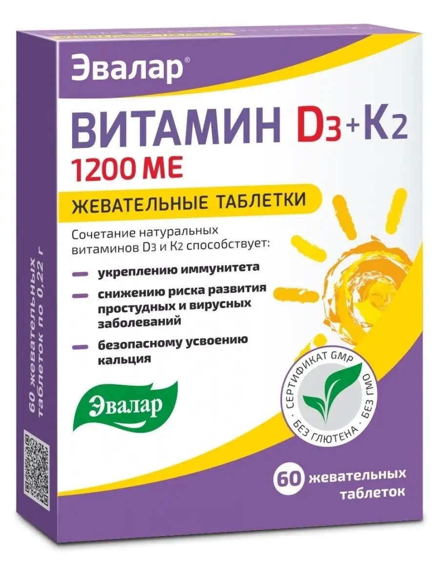 Эвалар Витамин Д3 К2 1200 ME, 60 таблеток