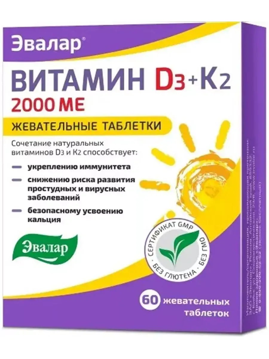 Эвалар Витамин Д3 2000 МЕ + К2, 60 шт – это комплексный препарат, разработанный специально для поддержания здоровья костей и мышц. Каждая таблетка содержит 2 000 Международных Единиц витамина D3. За счет специальной формулы препарат быстро усваивается, обладает приятным вкусом и ароматом. Его рекомендуется принимать во время осенне-зимнего периода, когда уровень естественного солнечного света снижается, а также при нарушении обмена кальция в организме. Одна упаковка содержит 60 зубных таблеток, что обеспечивает достаточное количество витамина на месяц. Выпускается препарат под маркой Эвалар, известной своим качеством и надежностью.