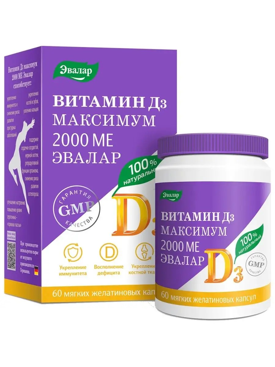| Комплектация | Витамин Д3 максимум 2000 МЕ Эвалар, мягкие желатиновые капсулы №60 по 0,3 г; витамины; витамин Д; витамин Д3; д3 |