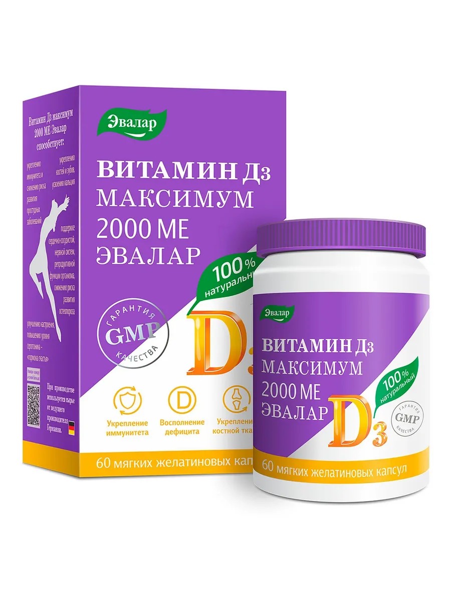 За последние несколько лет во всем мире выросла популярность витамина D3. По данным ВОЗ, 80% россиян испытывает дефицит витамина D3. Он очень важен для нашего здоровья, так как повышает иммунитет, снижает уровень воспаления и вирусной активности, а также участвует еще в двухстах функциях организма. Прием витамина D3 способствует снижению заболеваемости ОРВИ, в том числе новой коронавирусной инфекции COVID-192. Доказано, что в странах, где у пациентов с COVID-19 более высокое содержание в организме витамина D3 риск осложнений значительно ниже. Витамин D3 повышает защитные силы организма, снижает уровень "цитокинового шторма" (гипервоспаления), поддерживает функцию легких. Влияние витамина D3 на иммунную систему - Прием витамина D3 снижает риск развития ОРЗ в среднем на 12%; - Витамин D3 лучше принимать ежедневно, а не однократно (риск развития ОРЗ снижается на 19%); - У людей с исходно низким уровнем витамина D3 в крови риск развития ОРВИ на фоне дополнительного приема витамина D3 снижается на 70%; - Витамин D3 положительно влияет на работу легких, способствуя улучшению дыхательной функции; - У больных с пневмонией, а также на искусственной вентиляции легких, чаще встречается недостаточность витамина D3; - При низком уровне витамина D, выработка антител после вакцинации будет в несколько раз ниже. Витамин Д3 максимум 2000 МЕ Эвалар способствует: - Быстрому восполнению дефицита витамина D3 в организме; - Укреплению иммунитета; - Снижению риска развития простудных заболеваний; - Лучшему усвоению кальция, укреплению костей и зубов, снижению риска развития остеопороза; - Повышению силы мышц. Преимущества масляного раствора витамина D3: - Высокая дозировка натурального витамина D3 в 1 капсуле; - Мягкие желатиновые капсулы с высокоусваиваемым6 масляным раствором витамина D3; - Без глютена, ГМО и вспомогательных компонентов в составе; - Сырье от ведущего производителя из Германии. Форма выпуска: мягкие желатиновые капсулы по 0,3 г.