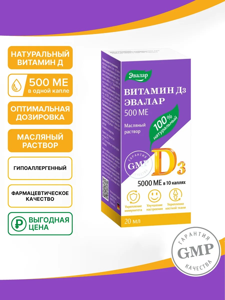 Натуральный витамин D3:- способствует восполнению его дефицита в организме, лучшему усвоению кальция, укреплению костей и зубов, снижению риска развития остеопороза; повышению силы мышц;- укреплению иммунитета и снижению риска развития простудных заболеваний;- участвует в поддержании сердечно-сосудистой, нервной систем и репродуктивной функции организма, в повышении уровня серотонина "гормона счастья" и улучшении настроения. Преимущества масляного раствора витамина D3:- Физиологичная для организма жирорастворимая форма витамина D3- Удобное дозирование (флакон с дозатором-капельницей)- Экономный расход препарата (20 000 МЕ в 1 мл)- Высокое усвоение за счет масляной формы- Нейтральный вкус и запах, хорошо воспринимается как детьми1, так и взрослыми- Не содержит аллергенных компонентов и спирта- Сырье высокого качества- Выгодная цена. Способ применения: Взрослым и детям с 3 лет – по 1 капле (500 МЕ) в день во время еды или согласно рекомендациям врача. Допускается добавлять в ложку с едой, на кусочек хлеба и т.д. Продолжительность приема – 1-2 месяца. Перед применением рекомендуется проконсультироваться с врачом. Перед применением БАД детьми – с врачом-педиатром.
