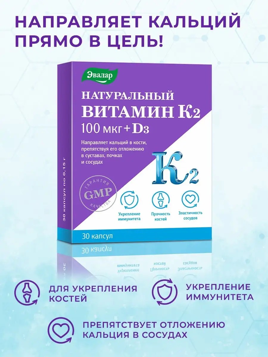 Витамины К2 и D3 -идеальный тандем для укрепления организма. В необходимых дозировках эти два витамина содержит Натуральный витамин К2 100 мкг+Д3 от компании Эвалар.Вместе витамин К2 и витамин D3 дополняют и усиливают действия друг друга, обеспечивая мощную поддержку для здоровья костей и сосудов. Натуральный витамин К2 100 мкг + Д3способствует:- нормализации кальциевого обмена, здоровья костей, зубов, сердечно-сосудистой системы;- полноценному и безопасному усвоению кальция;- укреплению иммунитета; повышению плотности костной ткани и эластичности сосудов;- снижению риска переломов костей;- профилактике остеопороза.