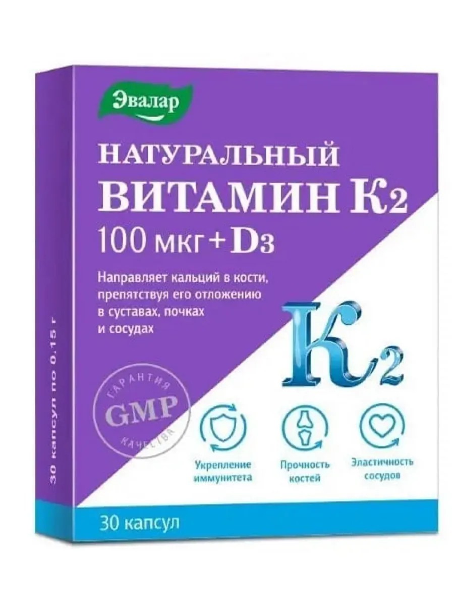 Эвалар натуральный витамин K2 100 мкг + Д3 30 шт. капсулы массой 0,15 г - это биологически активная добавка (БАД) к пище. Витамины К2 и D3 - идеальный тандем для укрепления организма. Вместе витамин К2 и витамин D3 дополняют и усиливают действия друг друга, обеспечивая мощную поддержку для здоровья костей и сосудов. Натуральный витамин К2 100 мкг + Д3 способствует: нормализации кальциевого обмена, здоровья костей, зубов, сердечно-сосудистой системы; полноценному и безопасному усвоению кальция; укреплению иммунитета; повышению плотности костной ткани и эластичности сосудов; снижению риска переломов костей; профилактике остеопороза. Кроме того, Натуральный витамин К2 100 мкг + Д3 направляет и удерживает кальций в костных тканях (кости, зубы), препятствуя его отложению в суставах, почках и сосудах (сосудистых стенках). Взрослым - по 1 капсуле в день во время еды. Продолжительность приема - 1 месяц. При необходимости прием можно повторять. Перед применением рекомендуется проконсультироваться с врачом.