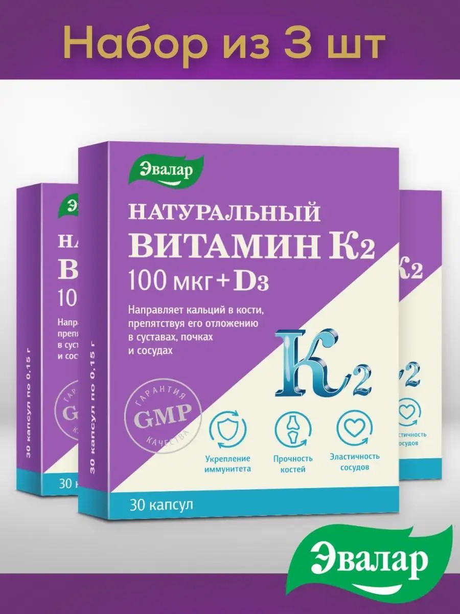 Натуральный витамин К2 усиленный витамином D3 для нормализации кальциевого обмена. Витаминный комплекс содержит натуральный витамин К2 100 мкг+Д3 от компании Эвалар. Витамины D3 и К2 способствуют правильному усвоению кальция, который необходим для поддержания прочности костей. Благодаря витамину К2 минерал направляется непосредственно в костную ткань, а не откладывается на стенках сосудов, в суставах и почках. Витамин К2 и витамин D3 дополняют и усиливают действия друг друга, обеспечивая мощную поддержку для здоровья костей и сосудов, способствуют нормализации кальциевого обмена, здоровью зубов, сердечно-сосудистой системы, полноценному и безопасному усвоению кальция, укреплению иммунитета, повышению плотности костной ткани и эластичности сосудов, снижению риска переломов костей, профилактике остеопороза.