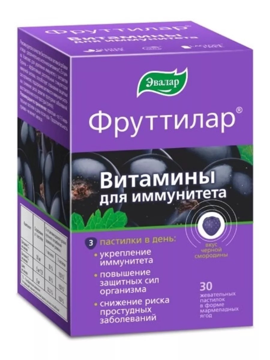 Фруттилар витамины для иммунитета пастилки жевательные в форме мармеладных ягод - это биологически активная добавка к пище . Они не содержат искусственных ароматизаторов, красителей, консервантов, лактозы, глютена и ГМО. Это комплекс для укрепления иммунитета с экстрактом бузины - эффективным растительным стимулятором иммунной системы, витаминами С и Е, и Цинка. Фруттилар пастилки жевательные способствуют повышению защитных сил организма, поддержанию активности иммунной системы, снижению риска развития простудных заболеваний, восстановлению после простуды (гриппа). Рекомендуется взрослым - по 1-3 жевательные пастилки в день после еды. Продолжительность приема - не менее 1 месяца.