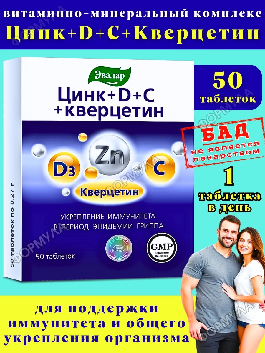 Эвалар Витамины для иммунитета Цинк+Д3+С+Кверцетин 50таб*1уп