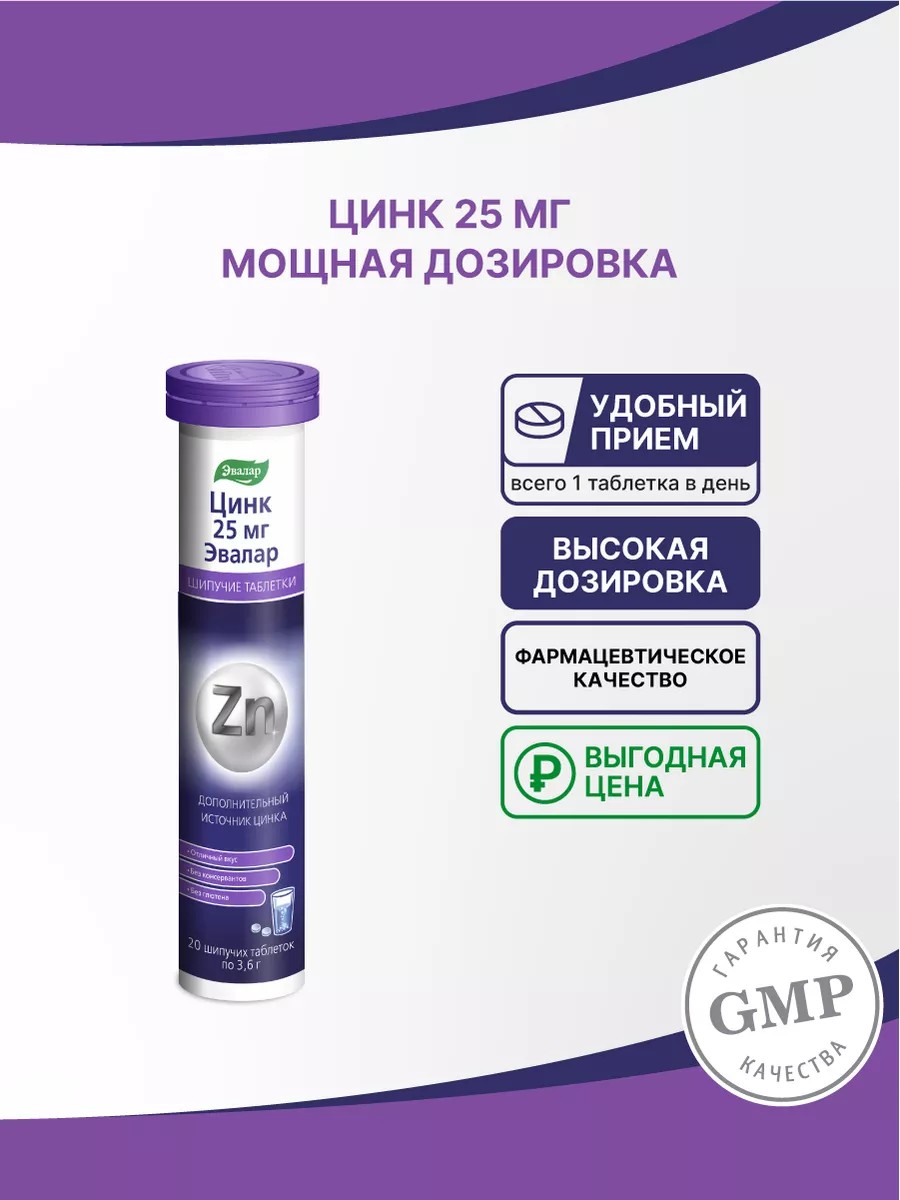 Increases interferon production. Interferons are proteins that are the body's first line of defense against infections by viruses, bacteria, and other microorganisms. If interferons are insufficient, the virus easily bypasses the defenses they build and achieves its goal of infecting cells. Zinc protects lymphocytes from destruction. Lymphocytes recognize invading agents and send a signal to T cells that the body is under attack. Evalar's Zinc 25 mg effervescent tablets offer a powerful dose of the mineral in one tablet. Advantages of Zinc in effervescent tablets from Evalar: - Easily accessible effervescent form; - Powerful dosage - 25 mg; - Convenient to take - just 1 tablet a day; - Excellent mango flavor; - Better price than similar products; - Gluten-free, dye-free, preservative-free; - Suitable for vegetarians; - High-quality raw materials; - Manufactured according to the international GMP quality standard. Directions for use: Adults - 1 tablet daily, dissolved in 200 ml of water. For conditions accompanied by an increased need for zinc - as recommended by a doctor. Duration of use - at least 1 month. If necessary, the course of treatment can be repeated. It is recommended to consult a doctor before use.