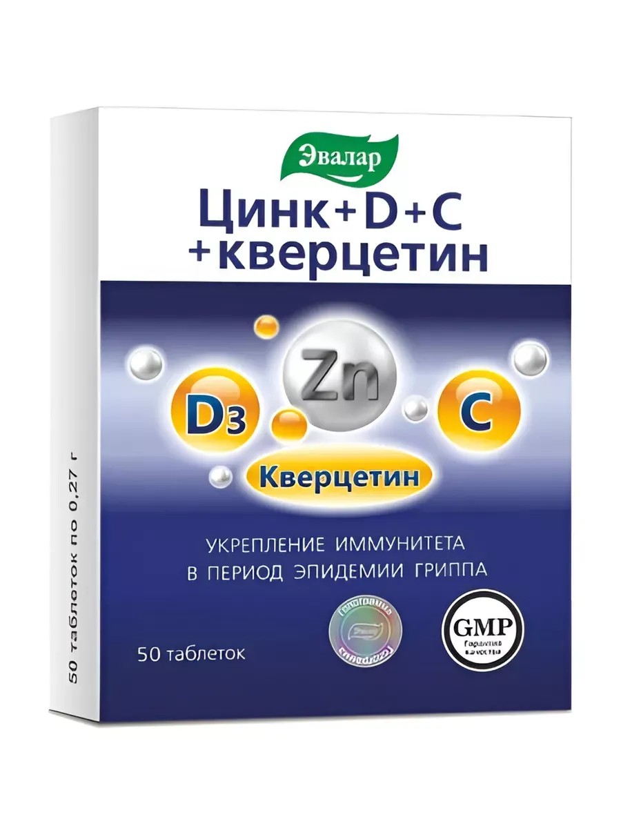 ЦИНК+D+С+КВЕРЦЕТИН - комплекс цинка, витамина D3, витамина С и кверцетина для укрепления иммунитета в период эпидемий и гриппаСочетание активных ингредиентов с выраженными антиоксидантными свойствами способствует укреплению иммунитета, восстановлению защитных сил организма в период сезонных эпидемий гриппа и простуды. Усовершенствованная формула для усиления иммунной поддержки, снижения риска простудных и вирусных заболеваний. Витамин D и кверцетин способствуют улучшению функционального состояния бронхов и легких, показателей внешнего дыхания, укреплению стенок кровеносных сосудов и капилляров.Прием 1 таблетки в день обеспечивает рекомендуемый уровень суточного потребления:цинка (12мг*) на 80%, Витамина С (90мг*) на 150%, D (500МЕ*) на 250%, кверцетина (10мг*) на 33%.Вирусы, бактерии, инфекции... Наш иммунитет постоянно подвергается их атаке. В периоды, когда эти болезнетворные организмы особенно активны, иммунная система уже не может справляться самостоятельно и нуждается в дополнительной поддержке. Но что же выбрать среди всего обилия противовирусных средств?Цинк+D+С+кверцетин от компании «Эвалар» - это усовершенствованная формула для усиления иммунной поддержки, снижения риска простудных и вирусных заболеваний.Он сочетает в себе сразу несколько активных иммуностимулирующих компонентов, которые в комплексе усиливают действия друг друга: цинк, витамин D, витамин С и кверцетин.