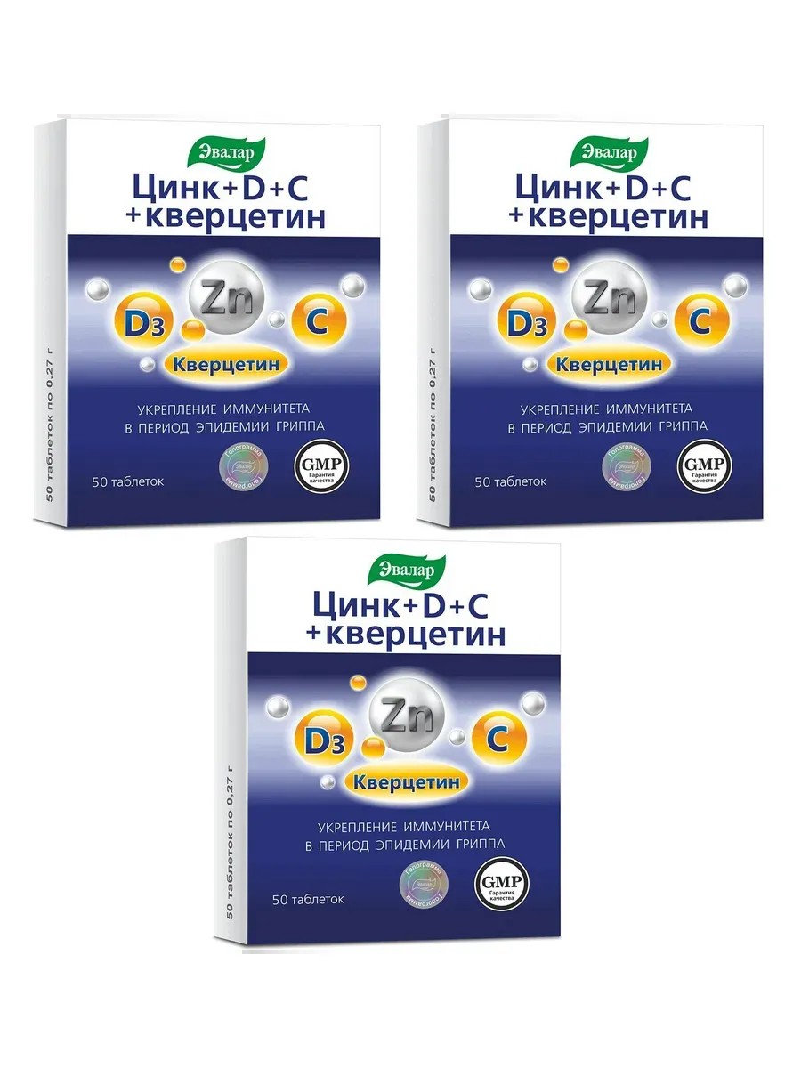 Эвалар Цинк+D+С+Кверцетин для иммунитета, 50 таб (0,27г) х 3 уп