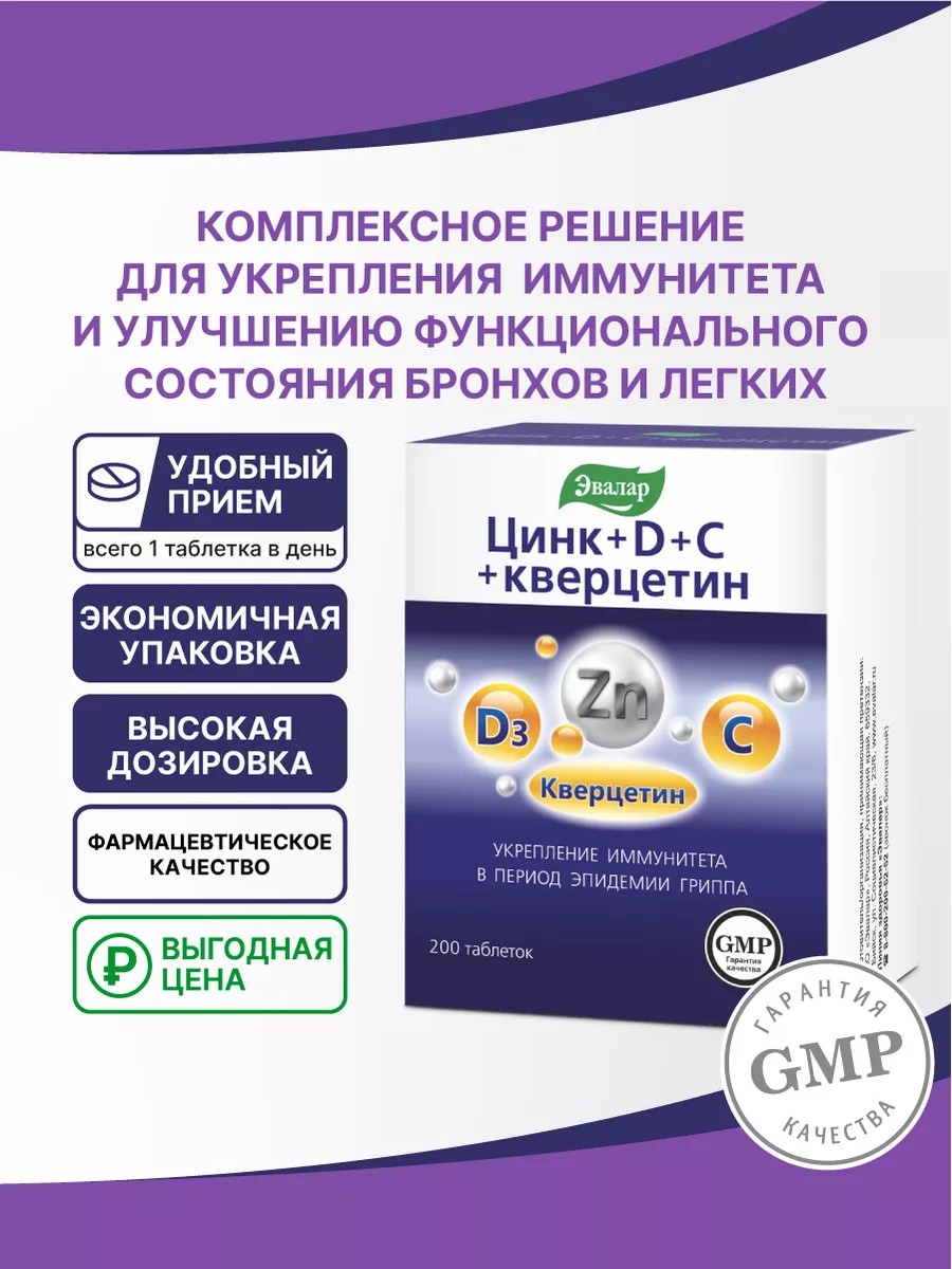 Вирусы, бактерии, инфекции Наш иммунитет постоянно подвергается их атаке. В периоды, когда эти болезнетворные организмы особенно активны, иммунная система уже не может справляться самостоятельно и нуждается в дополнительной поддержке. Но что же выбрать среди всего обилия противовирусных средств? Цинк+D+С+кверцетин от компании Эвалар-это усовершенствованная формула для усиления иммунной поддержки, снижения риска простудных и вирусных заболеваний. Он сочетает в себе сразу несколько активных иммуностимулирующих компонентов, которые в комплексе усиливают действия друг друга: цинк, витамин D, витамин С и кверцетин. Способ применения: Взрослым и детям старше 14 лет принимать по 1 таблетке в день во время еды. Продолжительность приема - не менее 1 месяца. При необходимости курс приема можно повторять. Рекомендуется ежедневный прием в период сезонных эпидемий гриппа и простуды.