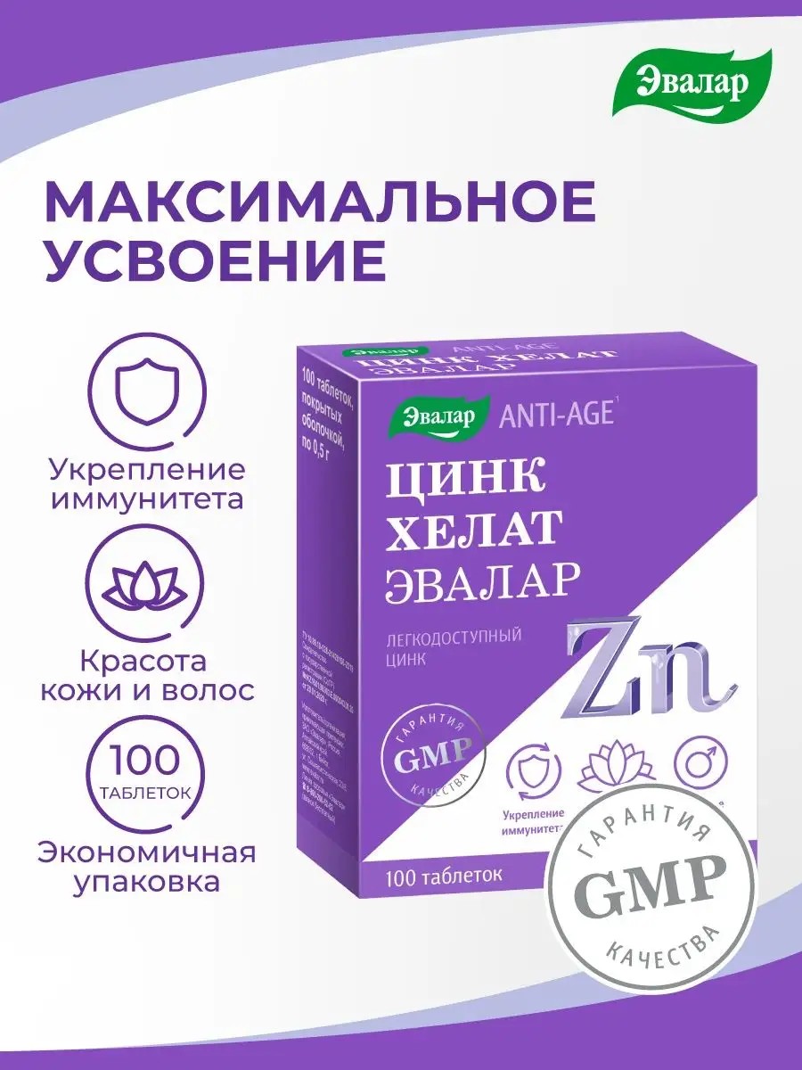 Цинк хелат от Эвалар способствует:- Повышению сопротивляемости организма к инфекциям (укреплению иммунитета);- Предотвращению выпадения волос;- Синтезу собственного коллагена;- Антиоксидантной защите (Anti-Age эффекту);- Усилению выработки инсулина;- Синтезу тестостерона;- Позволяет регулировать деятельность сальных желез, справляться с жирным блеском кожи и покраснениями;- Участвует в процессе сперматогенеза.Преимущества Цинк хелат "Эвалар":- Удобный прием - всего 1 таблетка в день;- Не вызывает побочных эффектов со стороны ЖКТ;- Экономичная упаковка;- Выгодная цена;- Сырье высокого качества;- Разрешен беременным и кормящим женщинам;- Произведен по международному стандарту качества GMP.