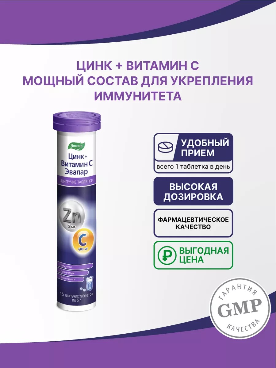 Zinc + Vitamin C from Evalar promotes: - strengthening the immune system - reducing the risk of developing colds and viral diseases - antioxidant protection - beautiful skin and hair. Long-term and regular use of Zinc + Vitamin C will ensure the smooth functioning of your body's defenses throughout the entire period of seasonal colds. Benefits of Zinc with Vitamin C from Evalar: - Easily accessible effervescent form - Powerful composition for strengthening the immune system - Convenient administration - just 1 tablet per day - High-quality raw materials. Directions for use: Adults take 1 tablet per day, dissolved in 200 ml of water. Duration of treatment is at least 1 month. If necessary, the course of treatment can be repeated. It is recommended to consult a doctor before use.