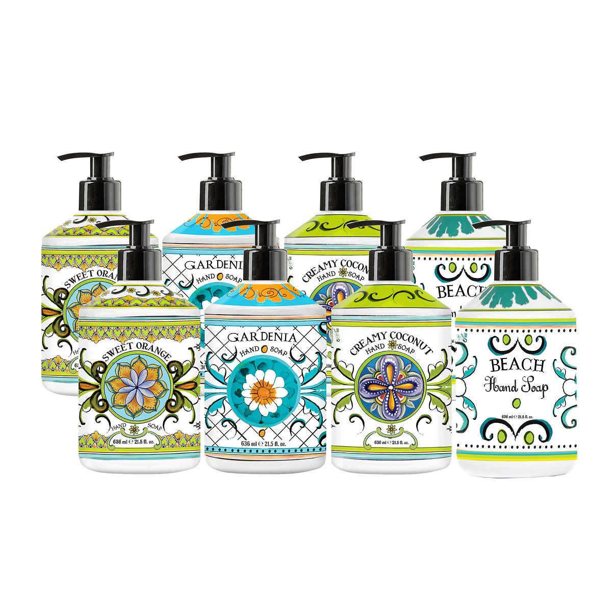 La Tasse hand soap collection is an Italian inspired design. Each unique bottle is beautifully designed with vibrant colors to fit any home. It features timeless fragrances of sweet orange , gardenia , beach and creamy coconut. Each bottle is reusable and refillable and will last for years. These hand soaps moisturize and gently cleanse the skin for a soft feel. This elegant collection makes an excellent gift.