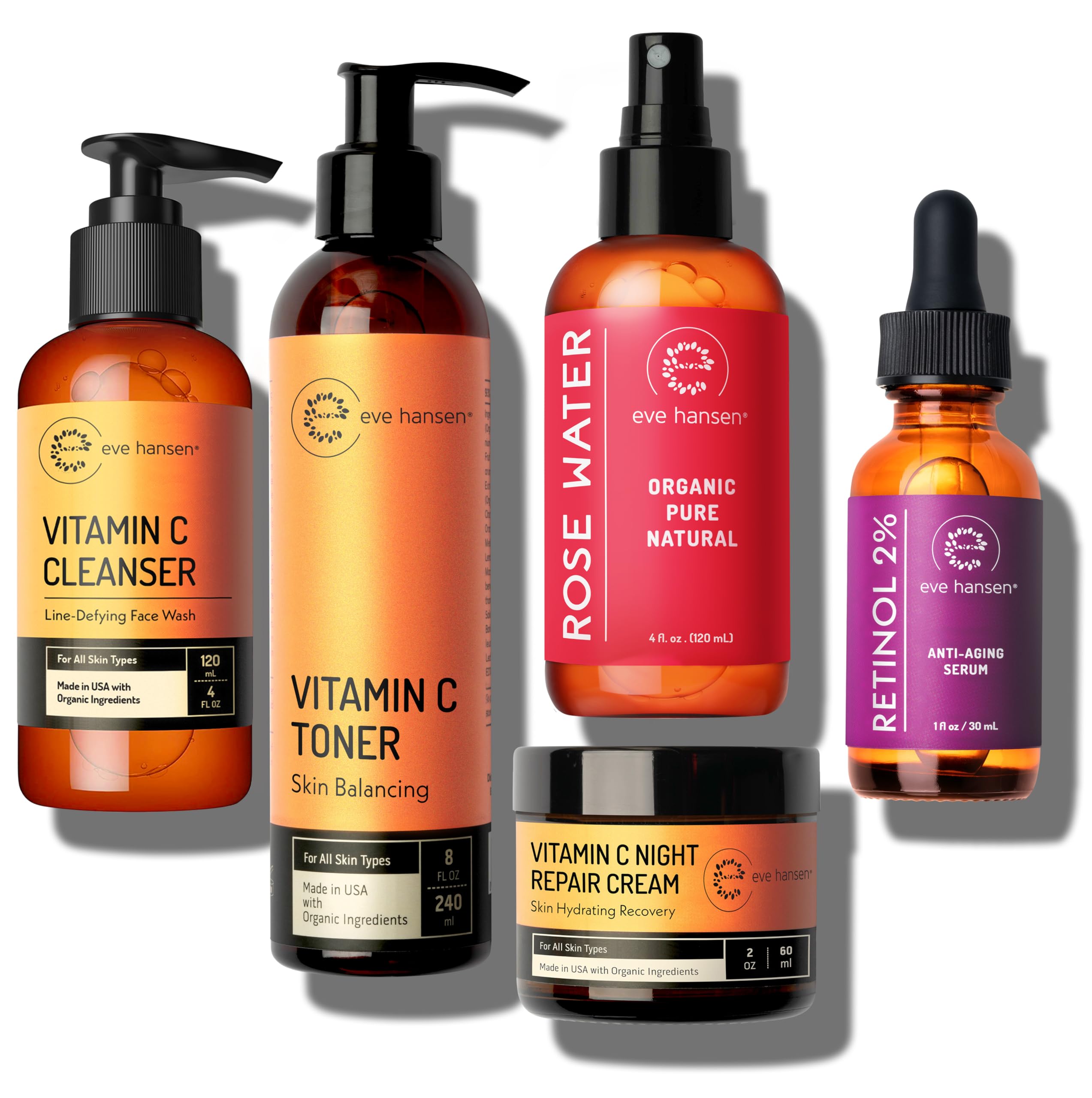 Eve Hansen Night Skincare Bundle Vitamin C Cleanser Vitamin C Toner Rose Water Retinol Serum & Night Repair Cream Hydrating & Nourishing Skincare for All Skin Types