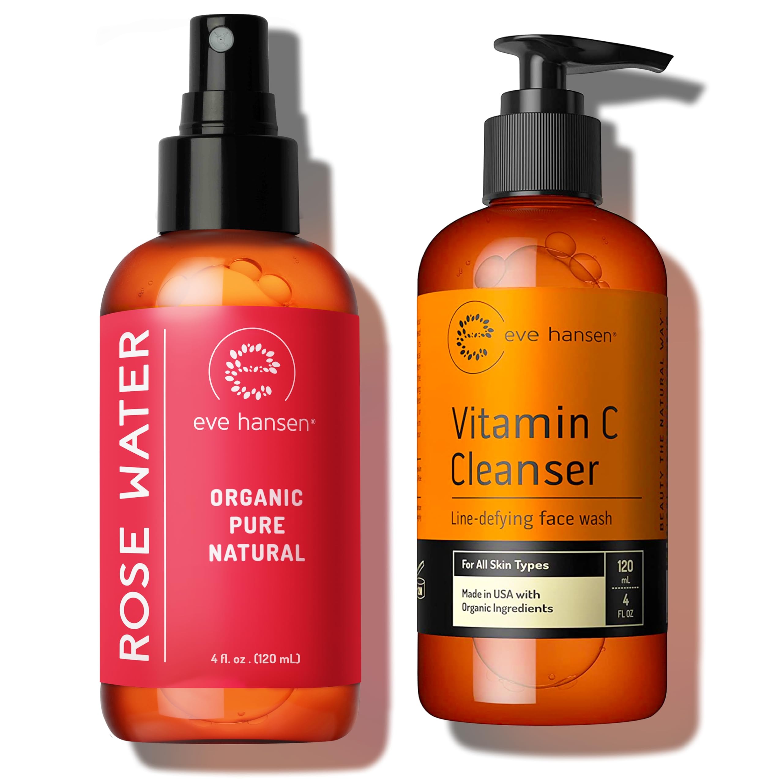 Eve Hansen Vitamin C Cleanser & Organic Rose Water Spray Bundle - Anti-Aging Facial Cleanser (4 oz) + Rosewater Toner & Setting Spray (4 oz)